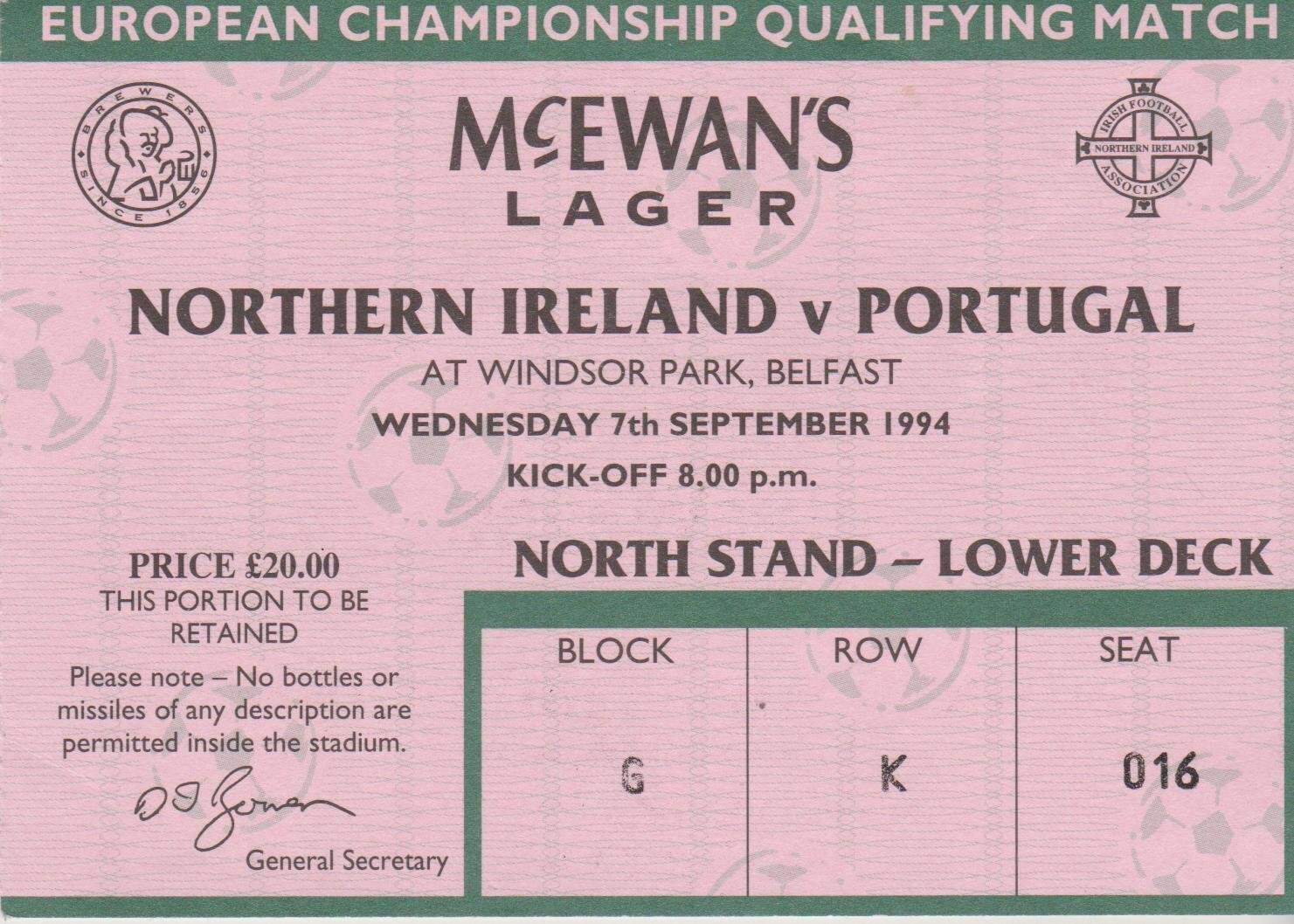 Match: Northern Ireland v Portugal Competition: European Championship Qualifying Group 6 Date: 07-Sep-1994 Comments: Rating: 4 Condition: Very good Weight in grams: 10