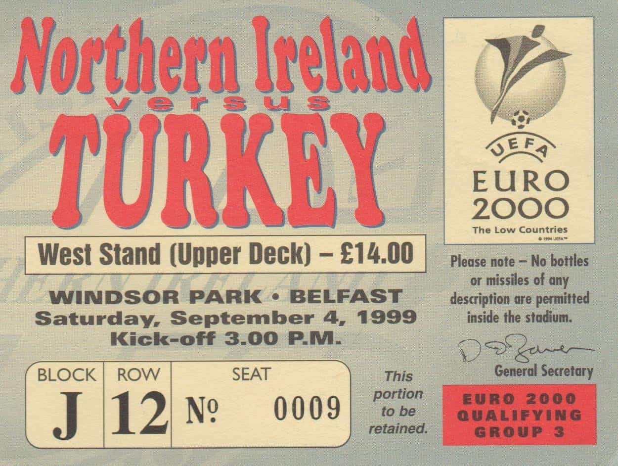Match: Northern Ireland v Turkey Competition: European Championship Qualifying Group 3 Date: 04-Sep-1999 Comments: Rating: 4 Condition: Very good Weight in grams: 10