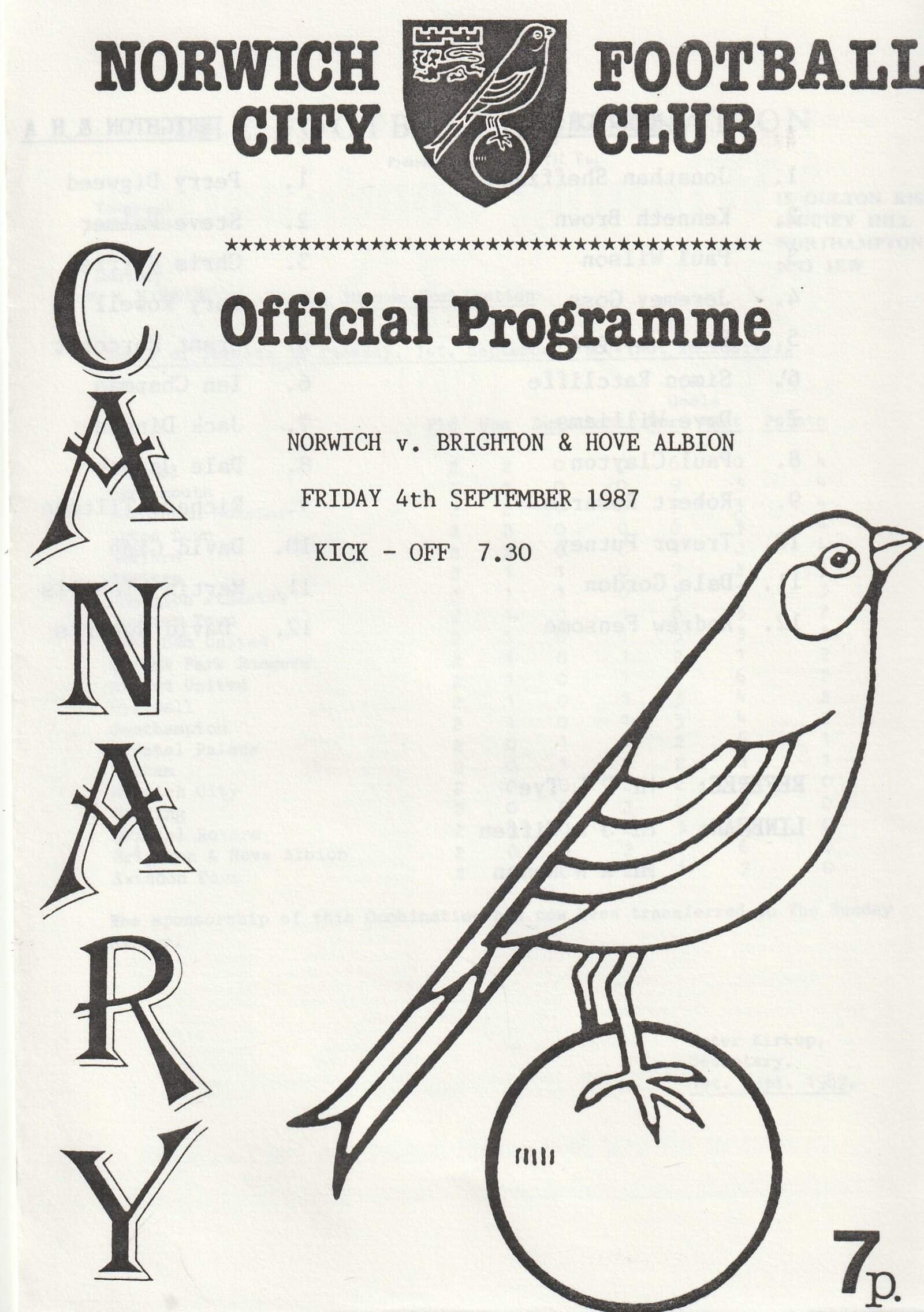 Match: Norwich City Reserves v Brighton & Hove Albion Reserves Competition: Football Combination Date: 04-Sep-1987 Comments: 4 page issue Rating: 4 Condition: Very good Weight in grams: 40