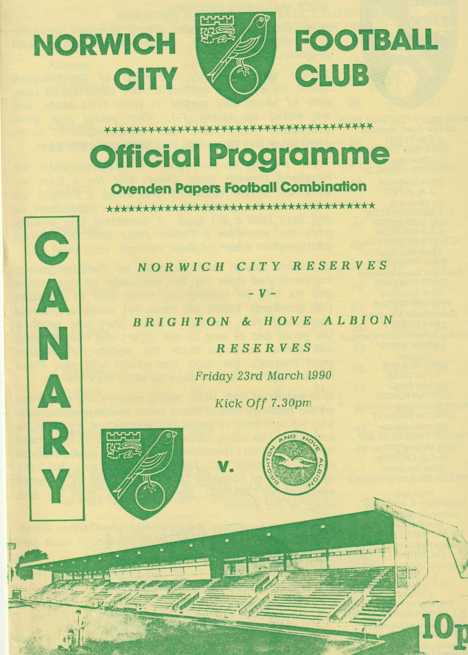 Match: Norwich City Reserves v Brighton & Hove Albion Reserves Competition: Football Combination Date: 23-Mar-1990 Comments: 4 page issue Rating: 4 Condition: Very good Weight in grams: 40