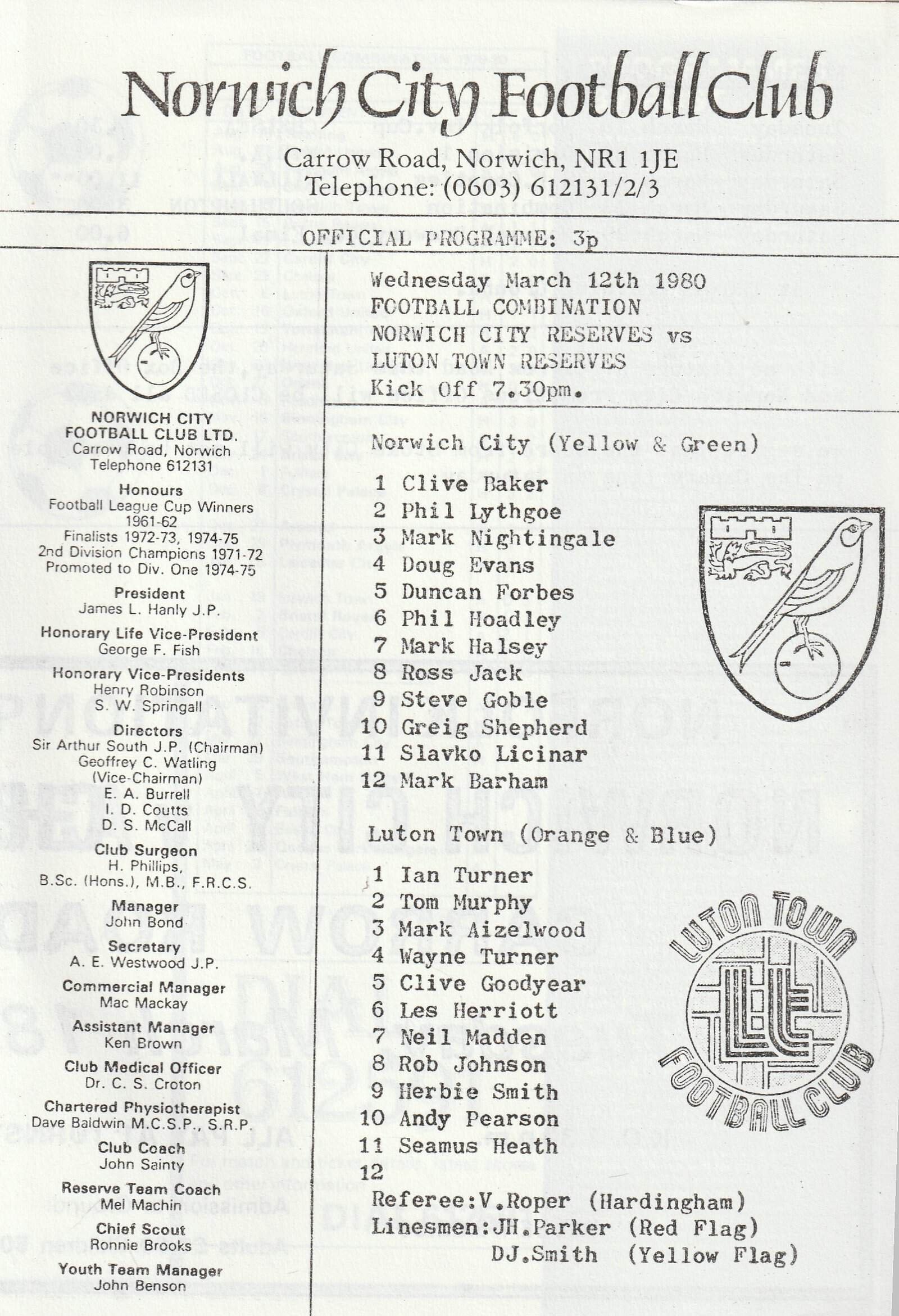 Match: Norwich City Reserves v Luton Town Reserves Competition: Football Combination Date: 12-Mar-1980 Comments: 4 page issue Rating: 4 Condition: Very good Weight in grams: 40