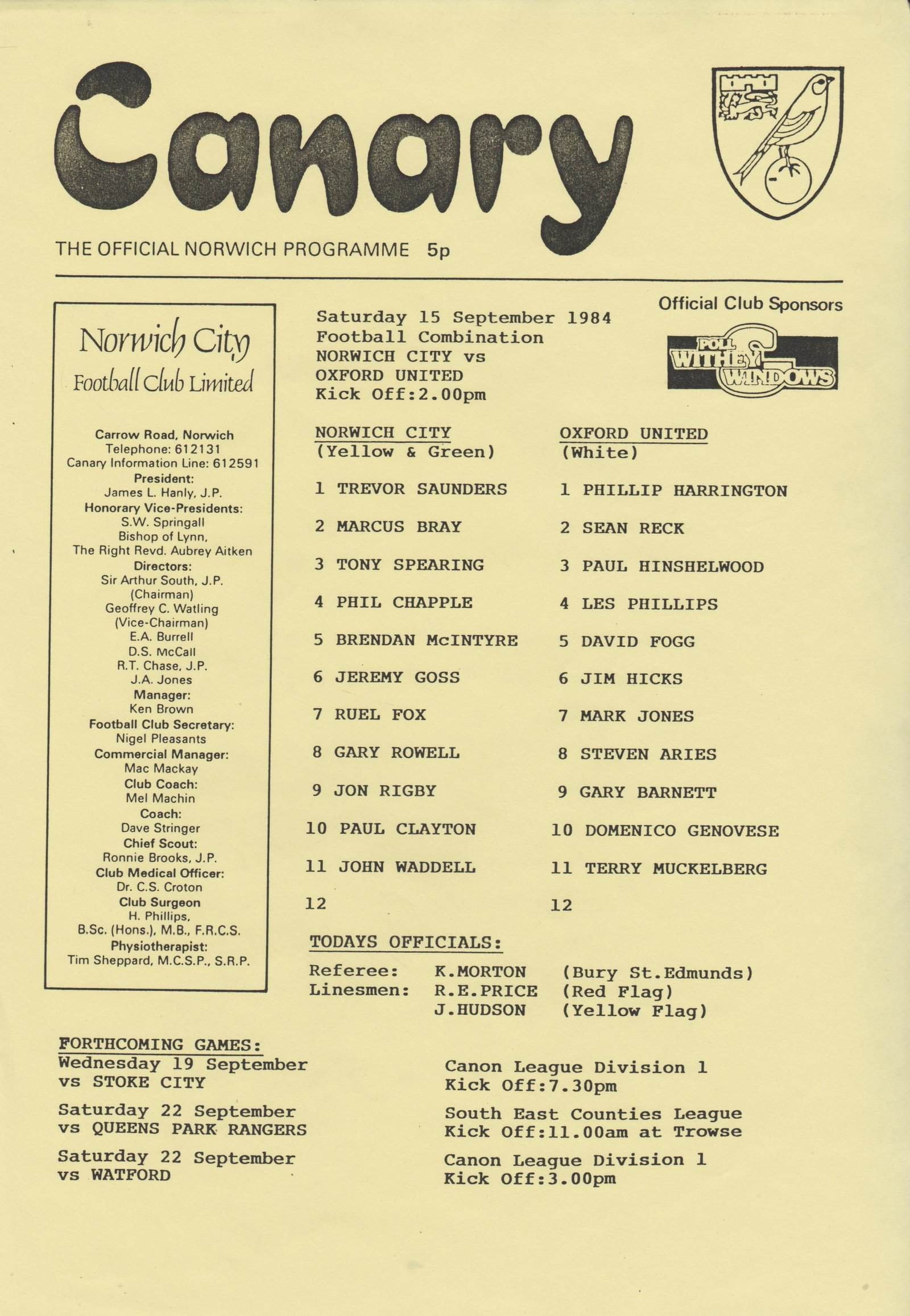 Match: Norwich City Reserves v Oxford United Reserves Competition: Football Combination Date: 15-Sep-1984 Comments: Single sheet Rating: 4 Condition: Very good Weight in grams: 20