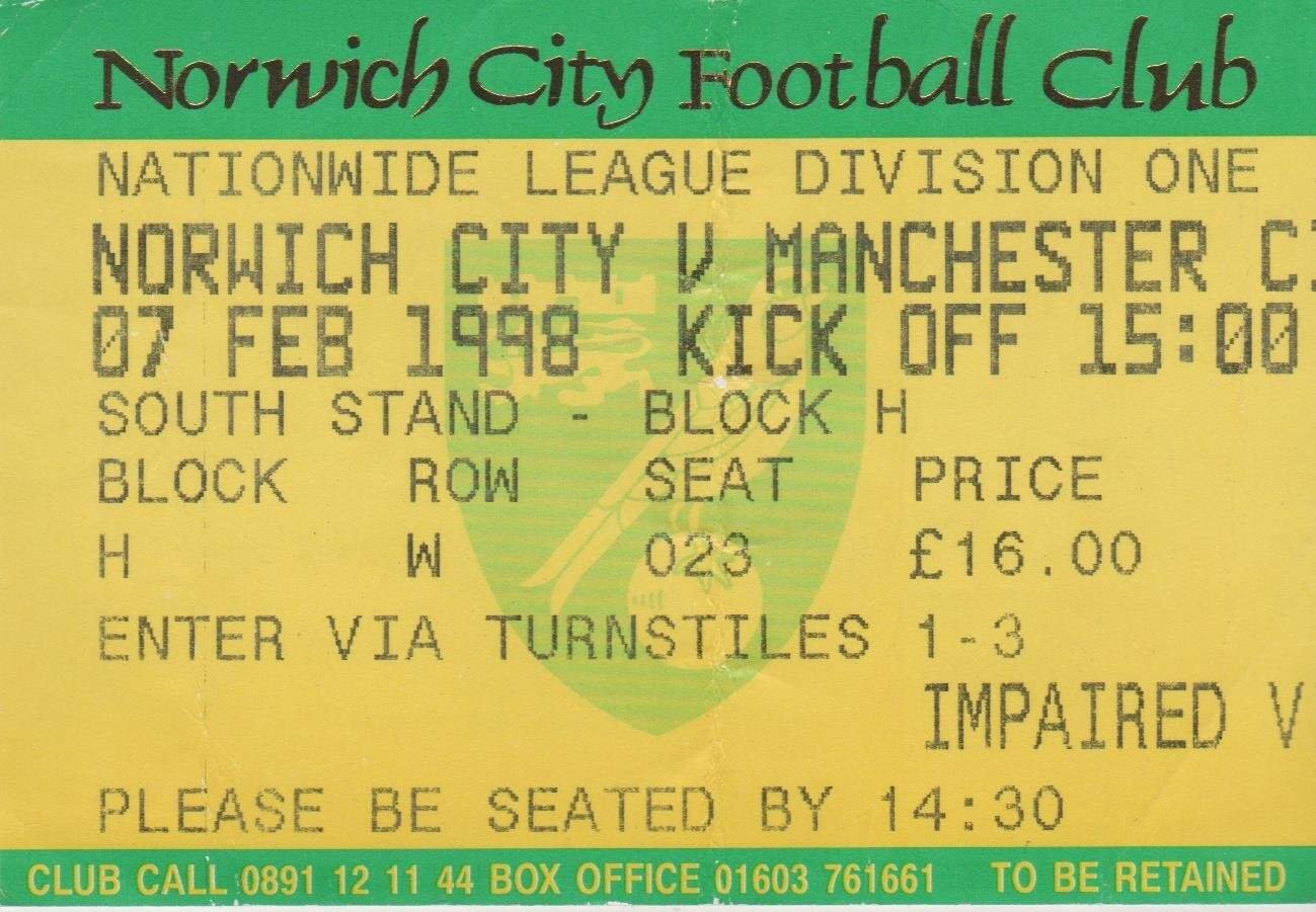 Match: Norwich City v Manchester City Competition: National League Division 1 Date: 07-Feb-1998 Comments: Rating: 3 Condition: Crease Weight in grams: 10