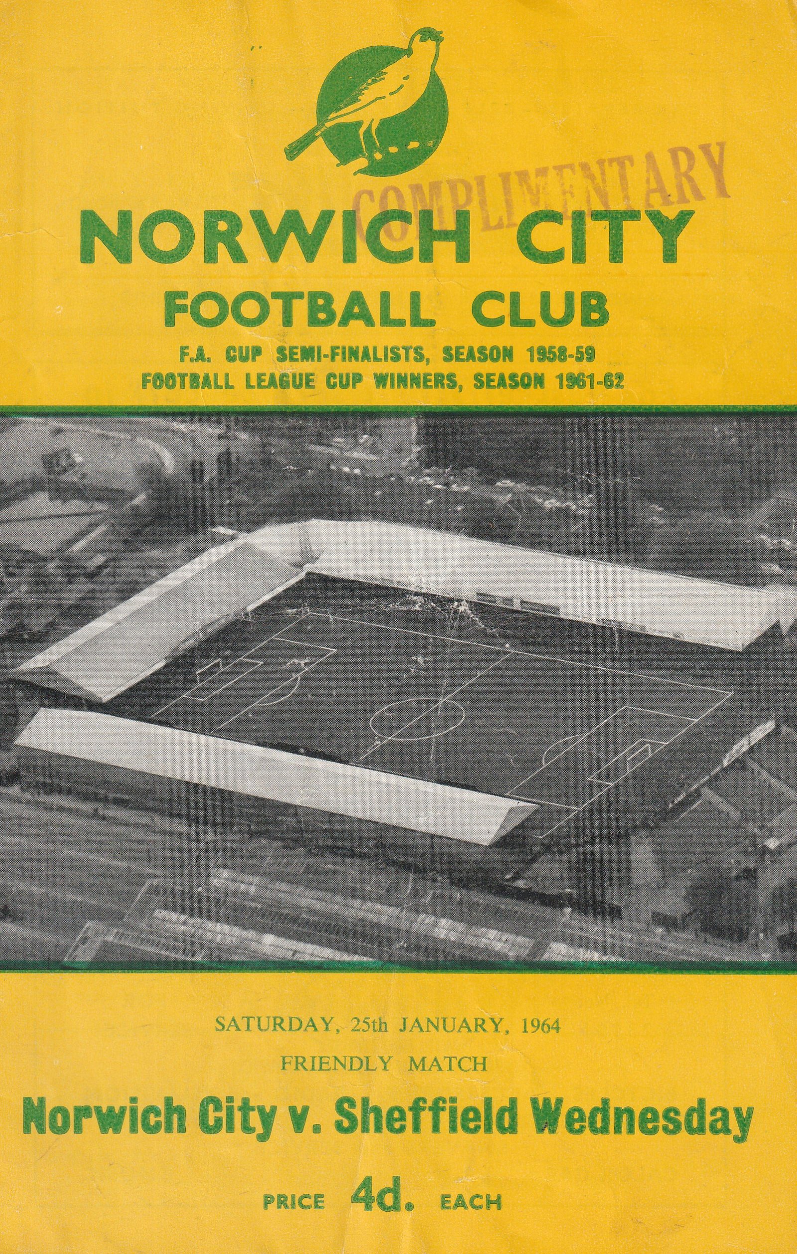 Match: Norwich City v Sheffield Wednesday Competition: Friendly Date: 25-Jan-1964 Comments: Rating: 3 Condition: Folds, light creases on back page Weight in grams: 100
