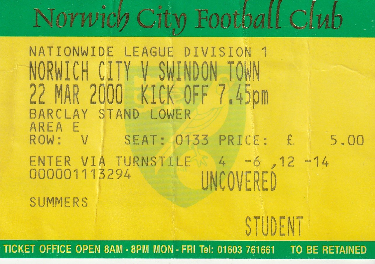 Match: Norwich City v Swindon Town Competition: League Division 1 Date: 22-Mar-2000 Comments: Rating: 3 Condition: Folds Weight in grams: 20