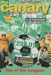 Match: Norwich City v Walsall Competition: League Division 1 Date: 05-02-2000 Comments: Rating: 4 Condition: Attendance in pencil on back Weight in grams: 140