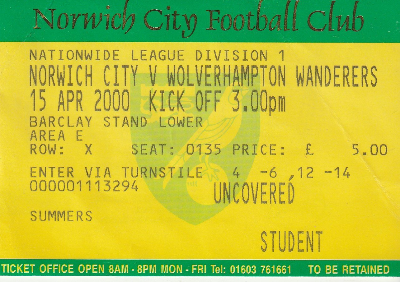 Match: Norwich City v Wolverhampton Wanderers Competition: League Division 1 Date: 15-Apr-2000 Comments: Rating: 3 Condition: Slight corner fold Weight in grams: 20