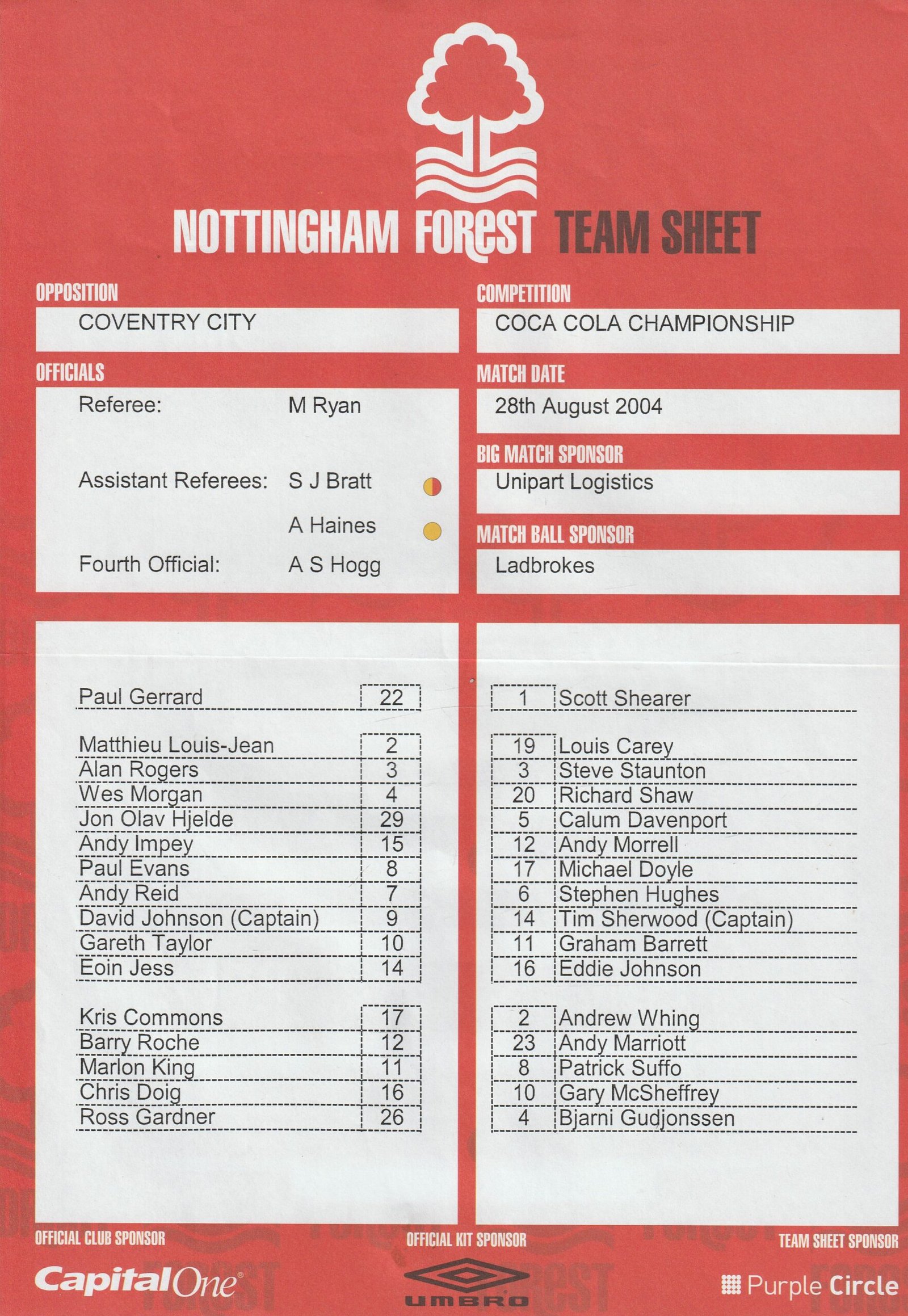 Match: Nottingham Forest v Coventry City Competition: League Championship Date: 28-08-2004 Comments: Rating: 4 Condition: Fold Weight in grams: 20