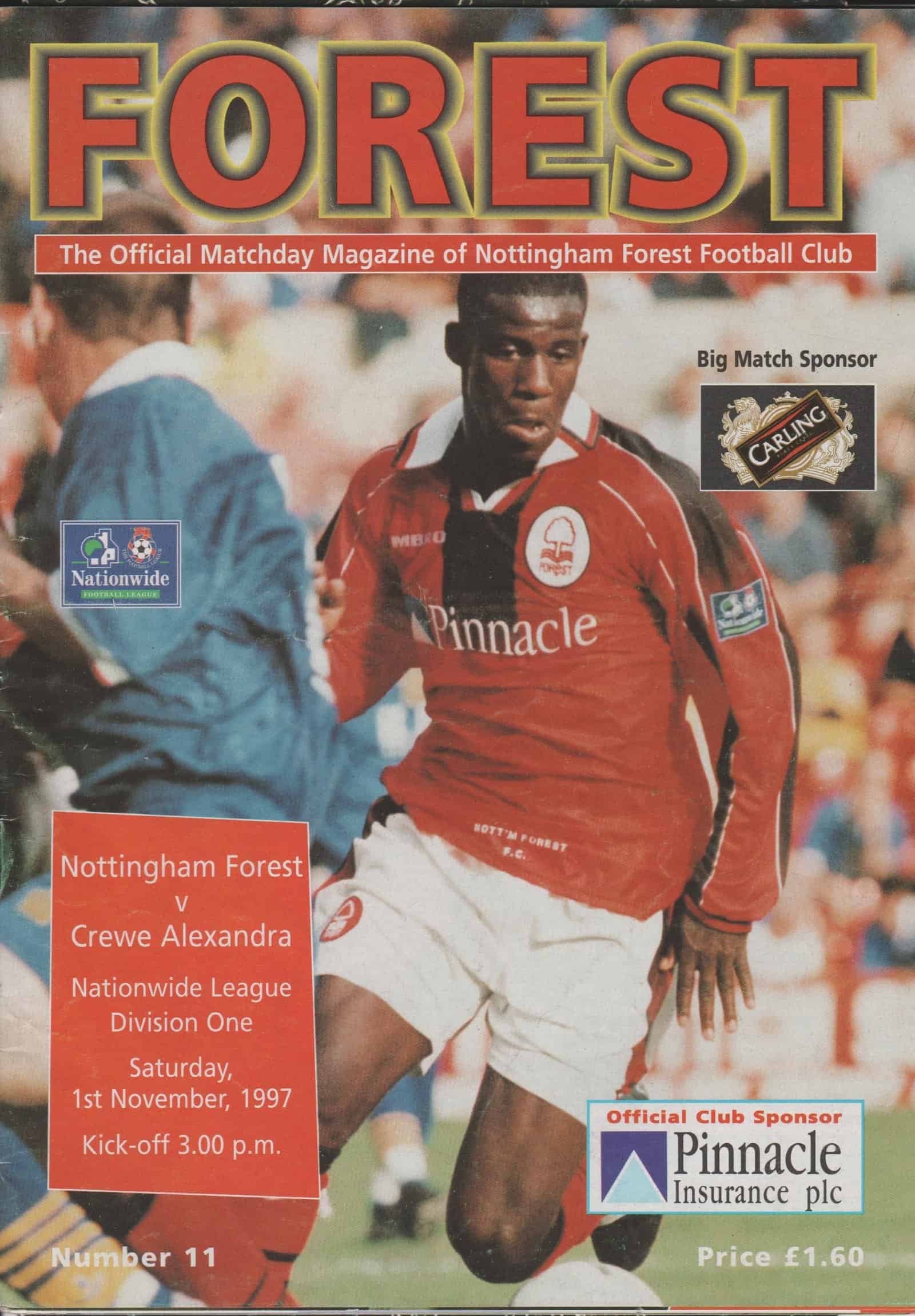 Match: Nottingham Forest v Crewe Alexandra Competition: League Division 1 Date: 01-11-1997 Comments: Rating: 4 Condition: Very good Weight in grams: 100