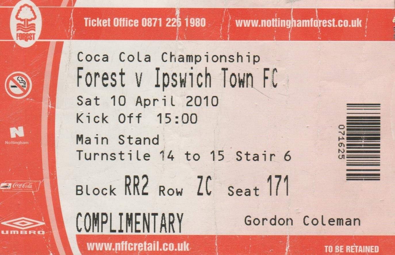 Match: Nottingham Forest v Ipswich Town Competition: Coca Cola Championship Date: 10-Apr-2010 Comments: Rating: 3 Condition: Crease Weight in grams: 10