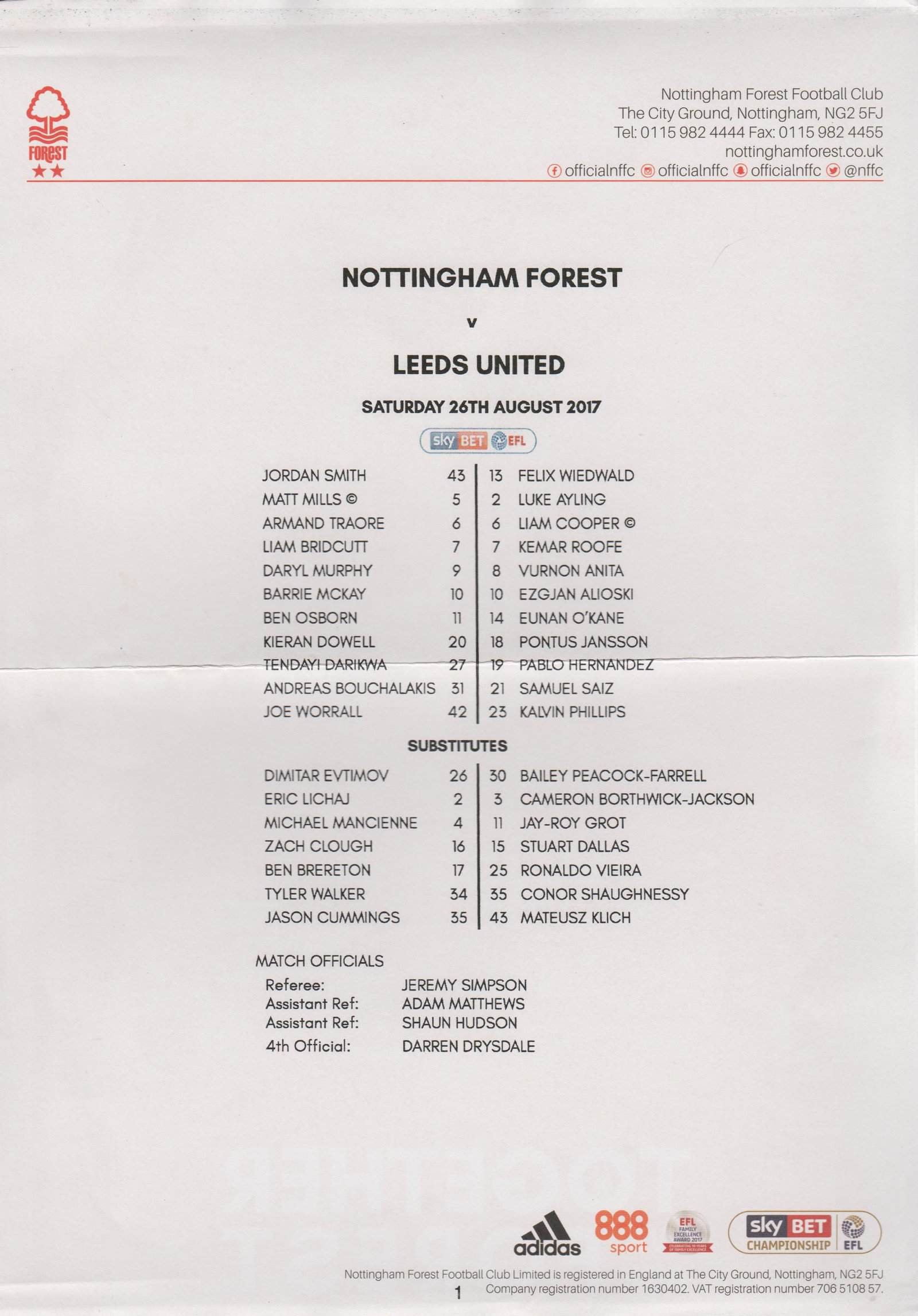 Match: Nottingham Forest v Leeds United Competition: Sky Bet Championship Date: 26-Aug-2017 Comments: Rating: 3 Condition: Fold, curving on edges Weight in grams: 20