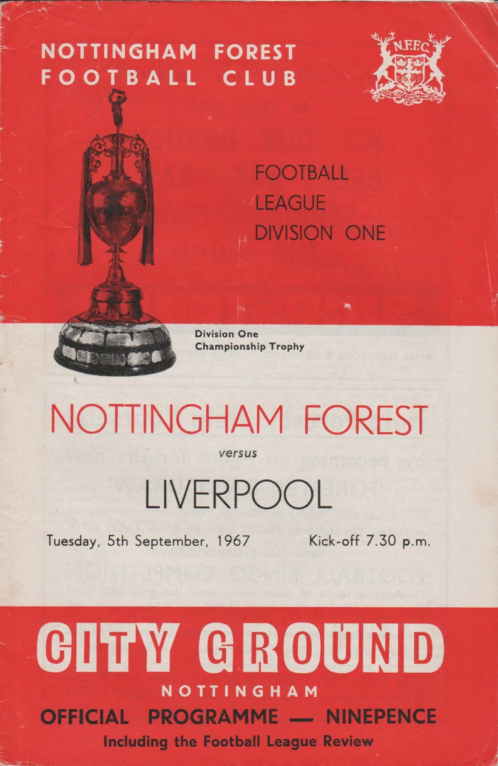 Match: Nottingham Forest v Liverpool Competition: League Division 1 Date: 05-09-1967 Comments: Rating: 3 Condition: Slight fold on corner of cover, crease on back page, team changes Weight in grams: 60