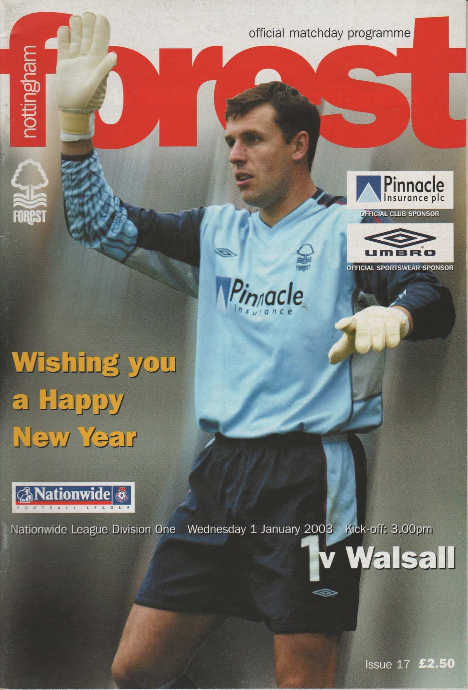 Match: Nottingham Forest v Walsall Competition: League Division 1 Date: 01-01-2003 Comments: Rating: 4 Condition: Very good Weight in grams: 180