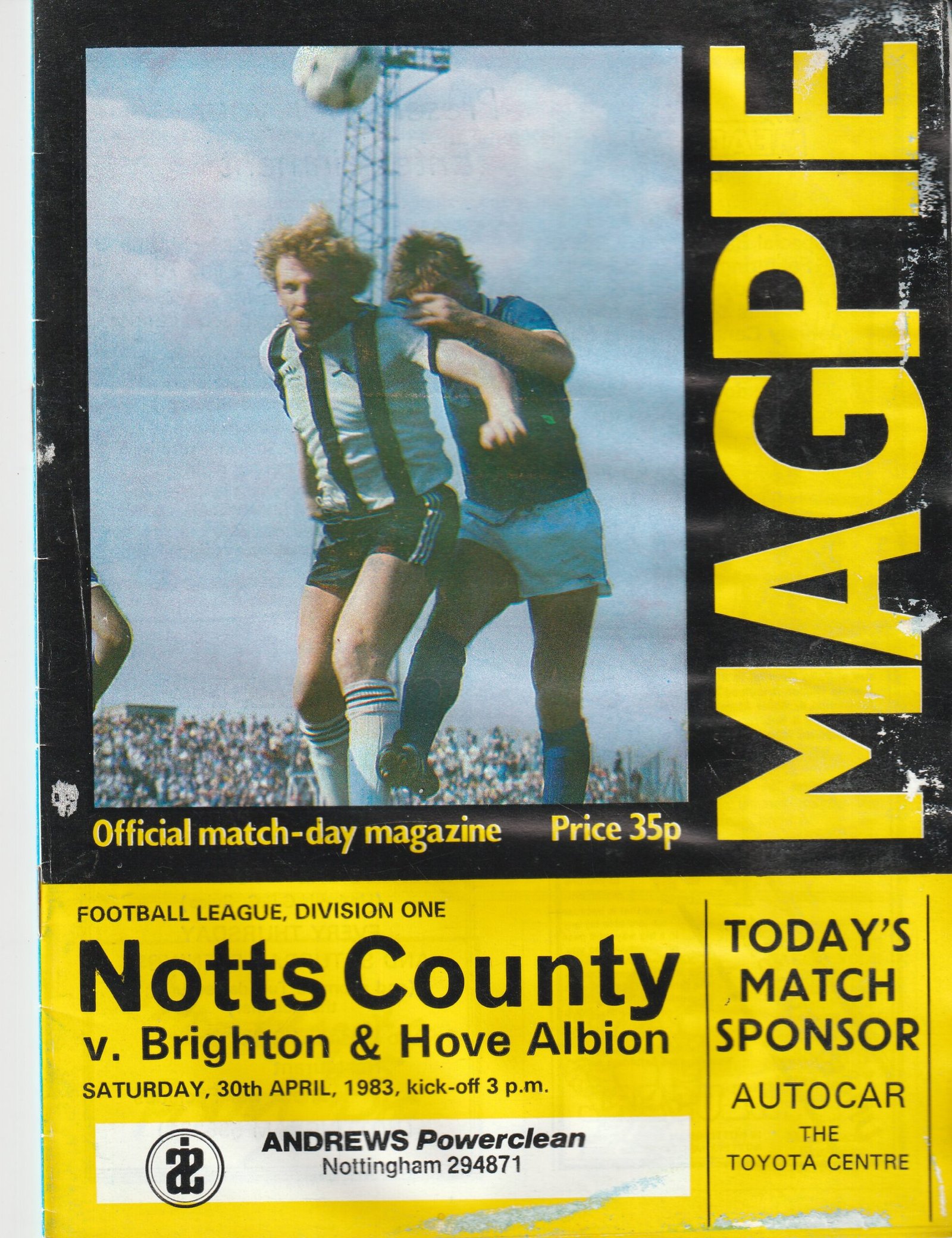 Match: Notts County v Brighton & Hove Albion Competition: League Division 1 Date: 30-Apr-1983 Comments: Rating: 3 Condition: Rippling throughout, Print loss on various pages Weight in grams: 100