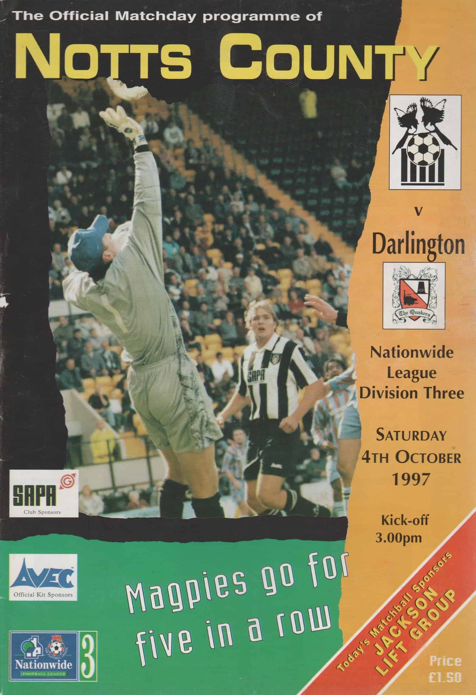 Match: Notts County v Darlington Competition: League Division 3 Date: 04-10-1997 Comments: Rating: 4 Condition: Slight mark on spine Weight in grams: 100