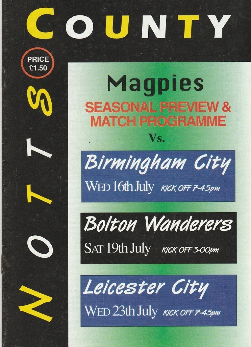 Match: Notts County v Leicester City Competition: Friendly Date: 23-Jul-1997 Comments: Joint issue for Birmingham City and Bolton Wanderers games Rating: 4 Condition: Very good Weight in grams: 100