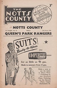 Match: Notts County v Queen’s Park Rangers Competition: League Division 3 Date: 30-03-1959 Comments: Rating: 4 Condition: Slight browning, Rusty staples, Weight in grams: 40