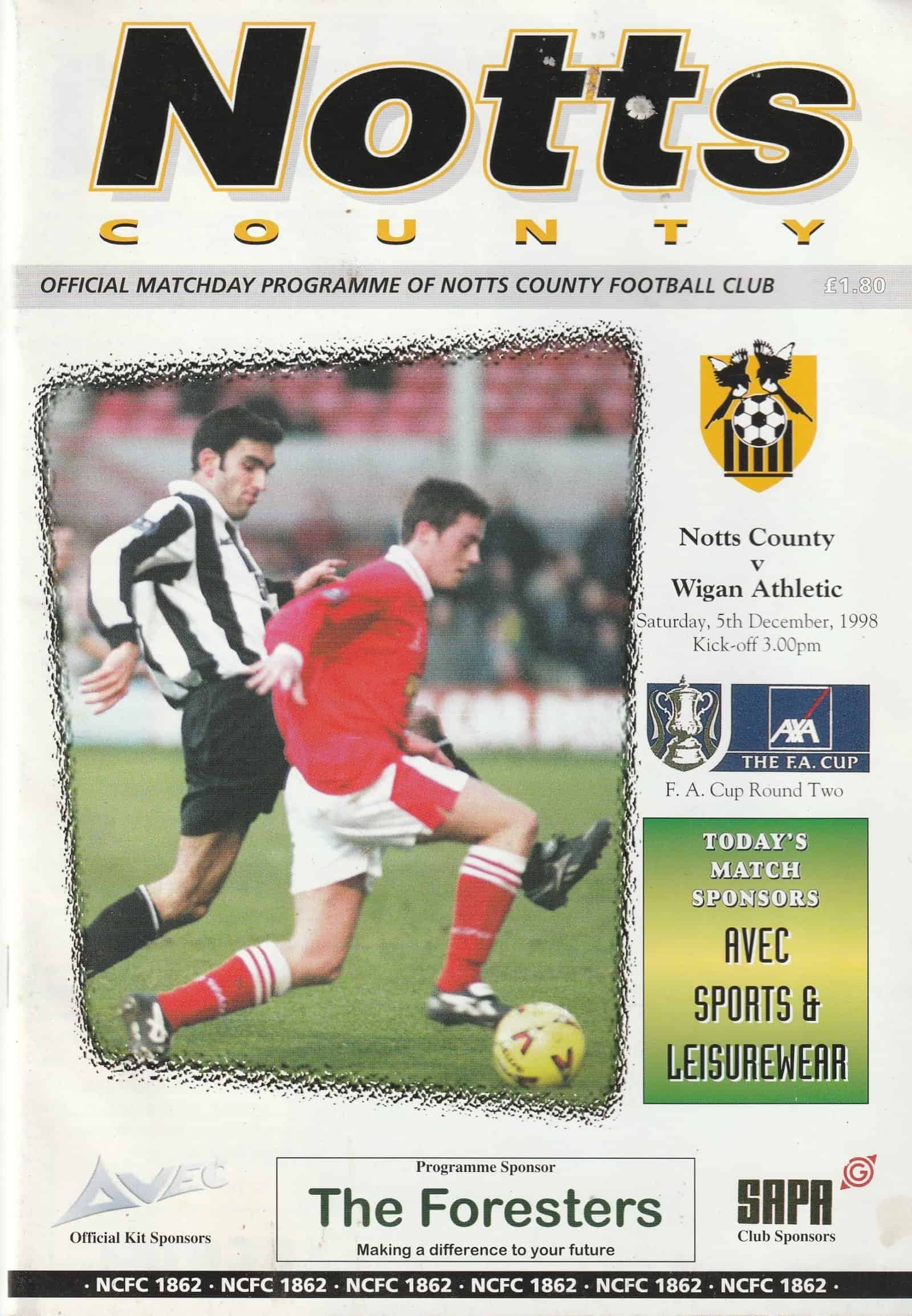 Match: Notts County v Wigan Athletic Competition: FA Cup 2nd Round Date: 05-Dec-1998 Comments: Rating: 4 Condition: Slight mark on cover Weight in grams: 140