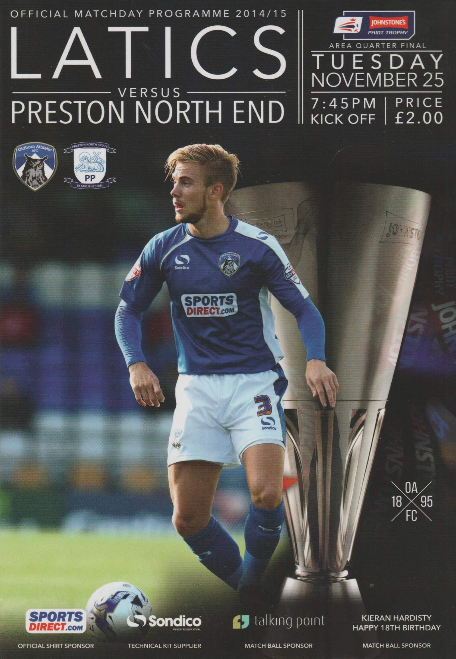 Match: Oldham Athletic v Preston North End Competition: Johnstone’s Paints Trophy Northern Quarter Final Date: 25-Nov-2014 Comments: Rating: 5 Condition: Excellent Weight in grams: 100