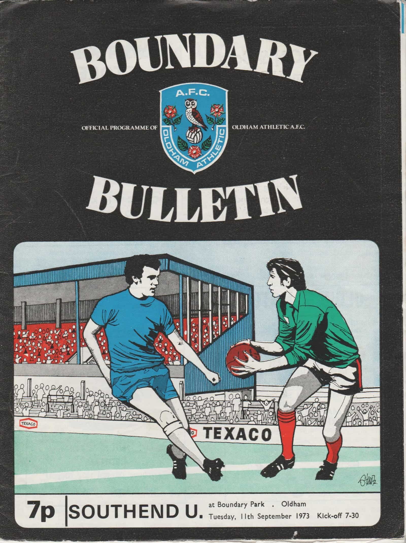 Match: Oldham Athletic v Southend United Competition: League Division 3 Date: 11-Sep-1973 Comments: Rating: 3 Condition: Slight marks on back page Weight in grams: 100