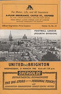 Match: Oxford United v Brighton and Hove Albion Competition: League Division 4 Date: 31-03-1965 Comments: Rating: 3 Condition: Score on face, corner crease on back, score on team line up page Weight in grams: 40