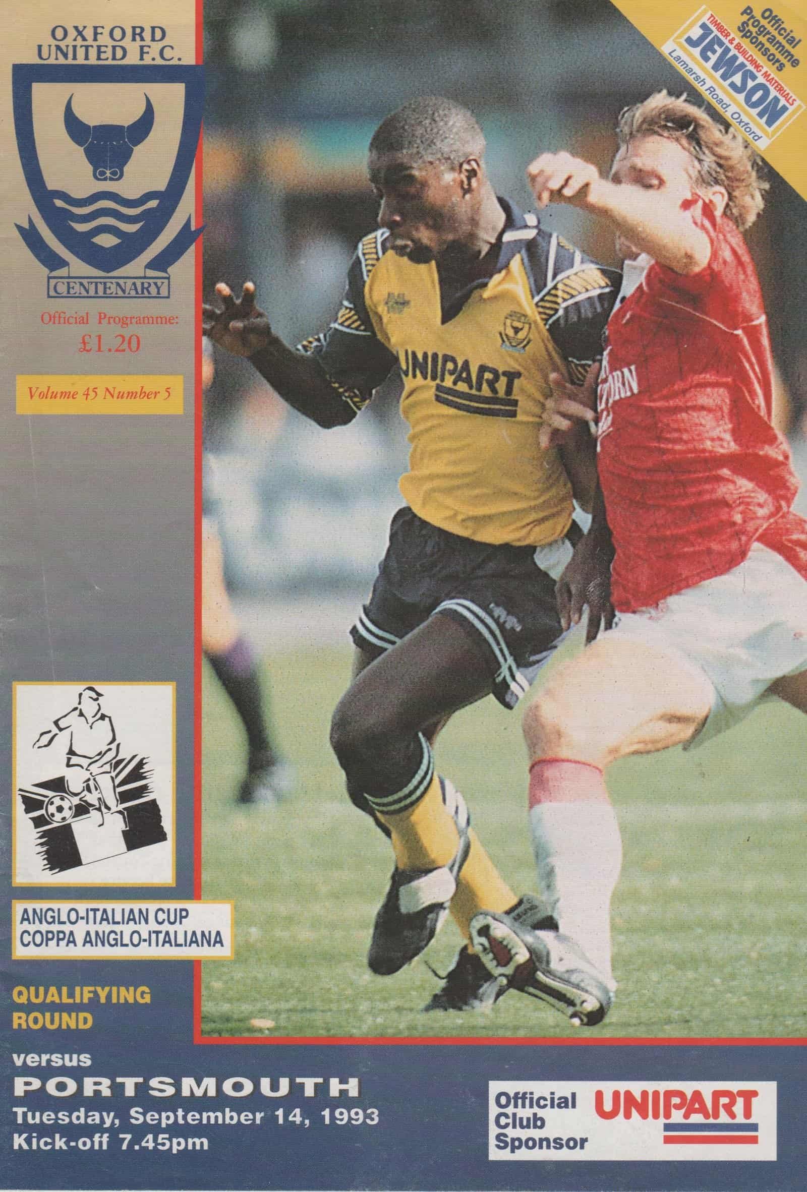 Match: Oxford United v Portsmouth Competition: Anglo Italian Cup Qualifying Round Date: 14-Sep-1993 Comments: Rating: 3 Condition: Light creases on back page Weight in grams: 80