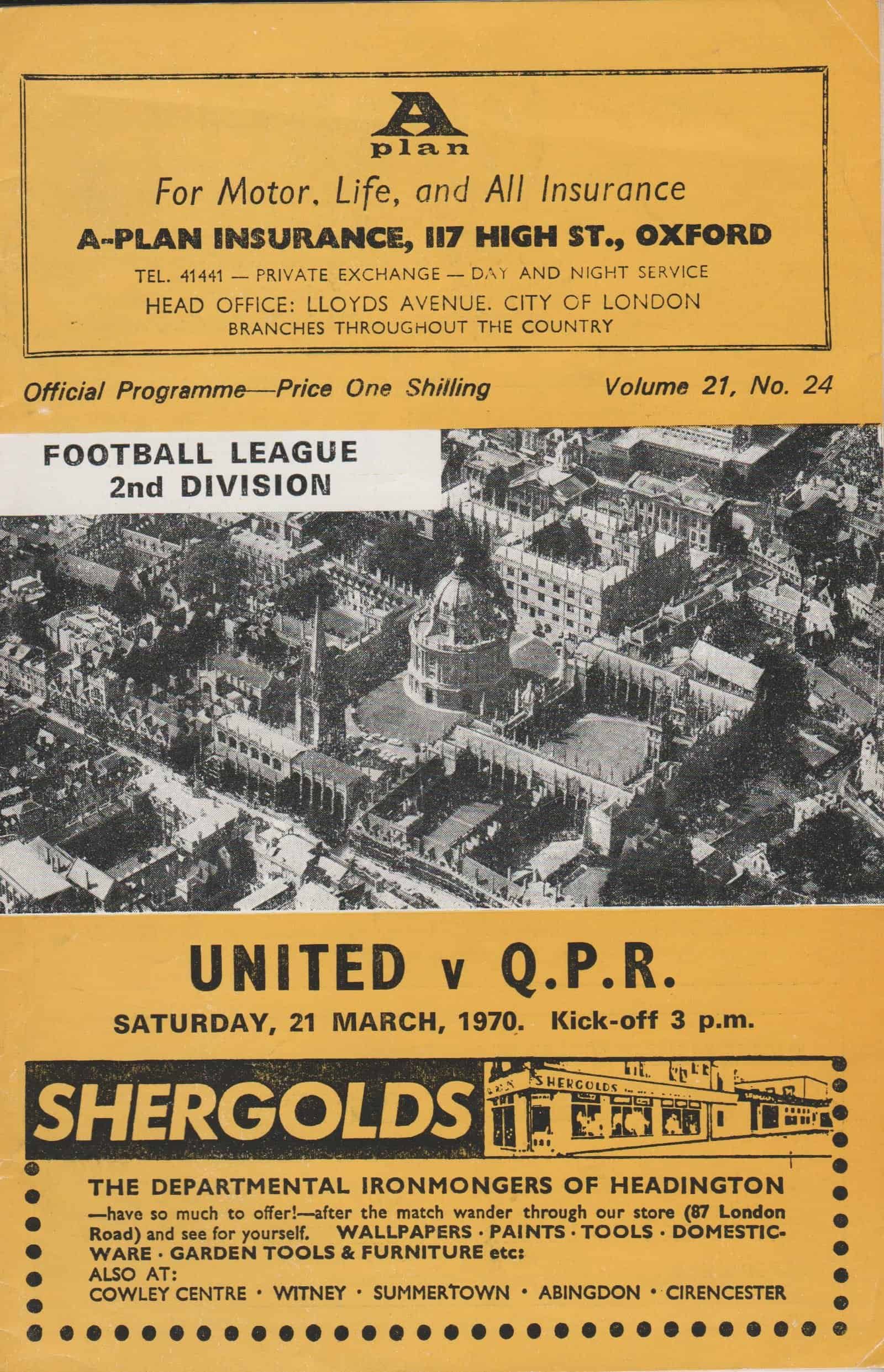 Match: Oxford United v Queens Park Rangers Competition: League Division 2 Date: 21-Mar-1970 Comments: Rating: 3 Condition: Piece missing on spine where staples removed Weight in grams: 60