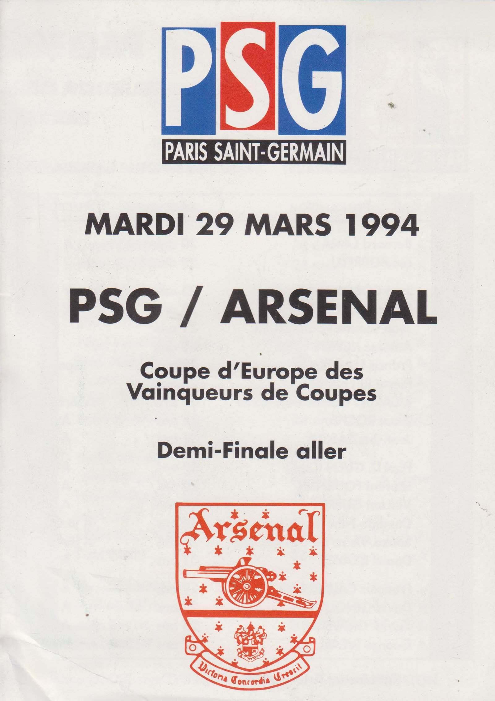Match: Paris St Germain v Arsenal Competition: European Cup Winners Cup Semi Final Date: 29-Mar-1994 Comments: 4 page issue Rating: 4 Condition: Very good Weight in grams: 40