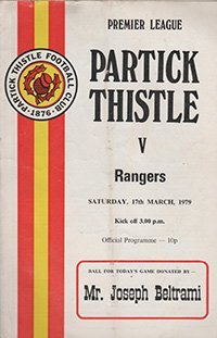 Match: Partick Thistle v Glasgow Rangers Competition: Scottish Premier League Date: 17-03-1979 Comments: Rating: 3 Condition: Crease, soiling on cover Weight in grams: 40