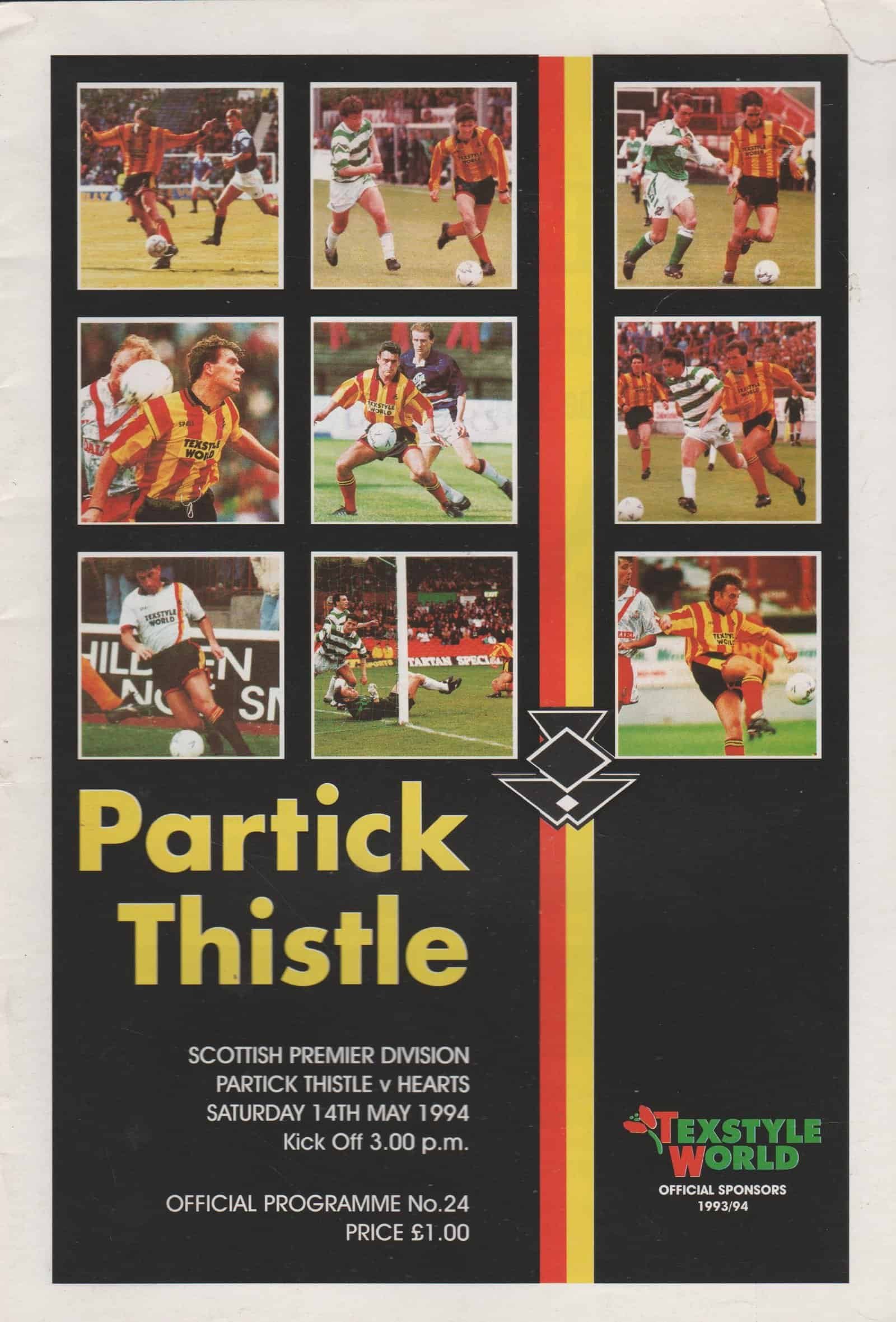Match: Partick Thistle v Heart of Midlothian Competition: Scottish Premier League Date: 14-May-1994 Comments: Rating: 3 Condition: Small piece missing off corner of cover Weight in grams: 100