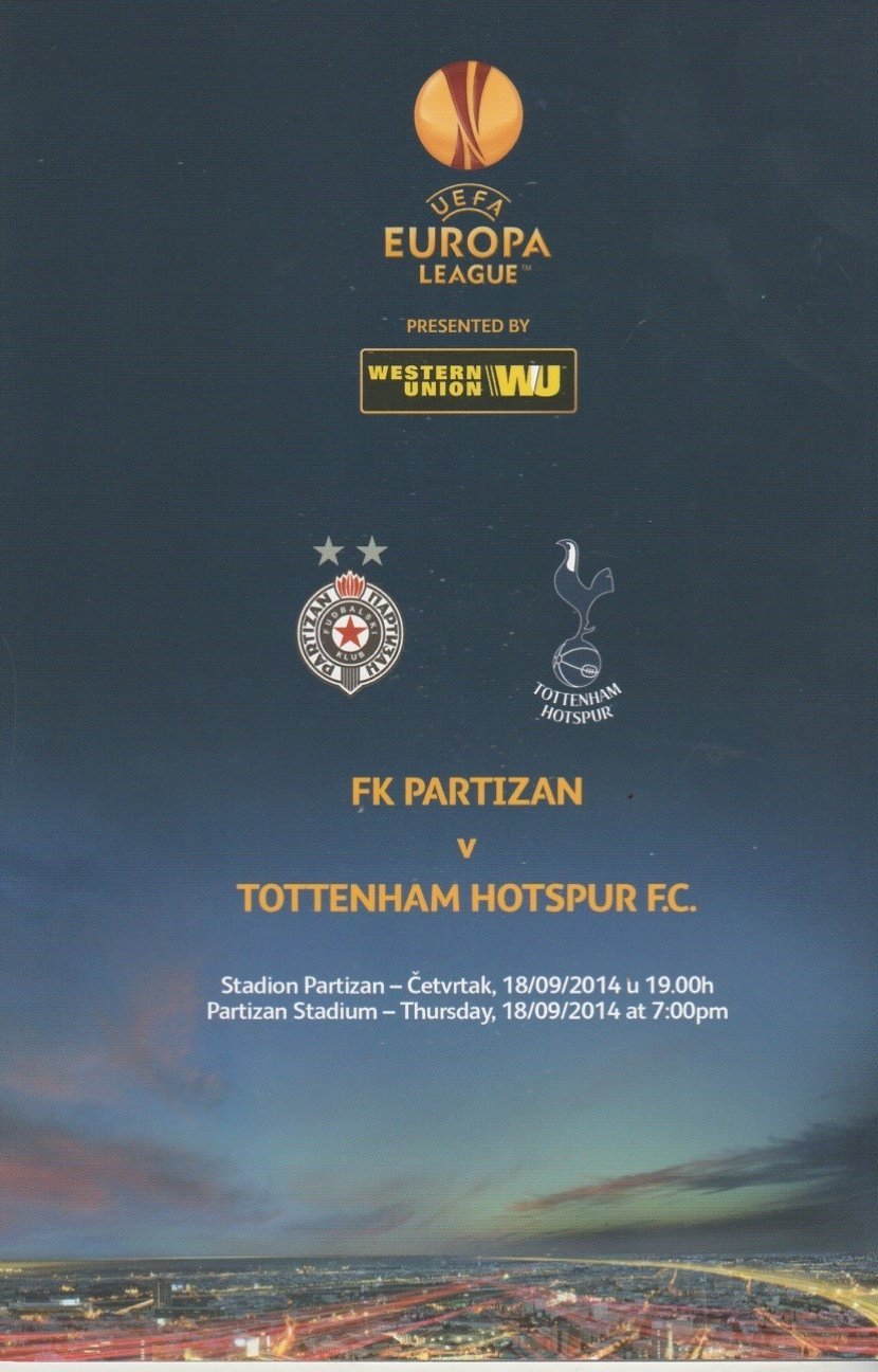 Match: Partizan Belgrade v Tottenham Hotspur Competition: UEFA Europa League Group C Date: 18-Sep-2014 Comments: Rating: 5 Condition: Excellent Weight in grams: 120