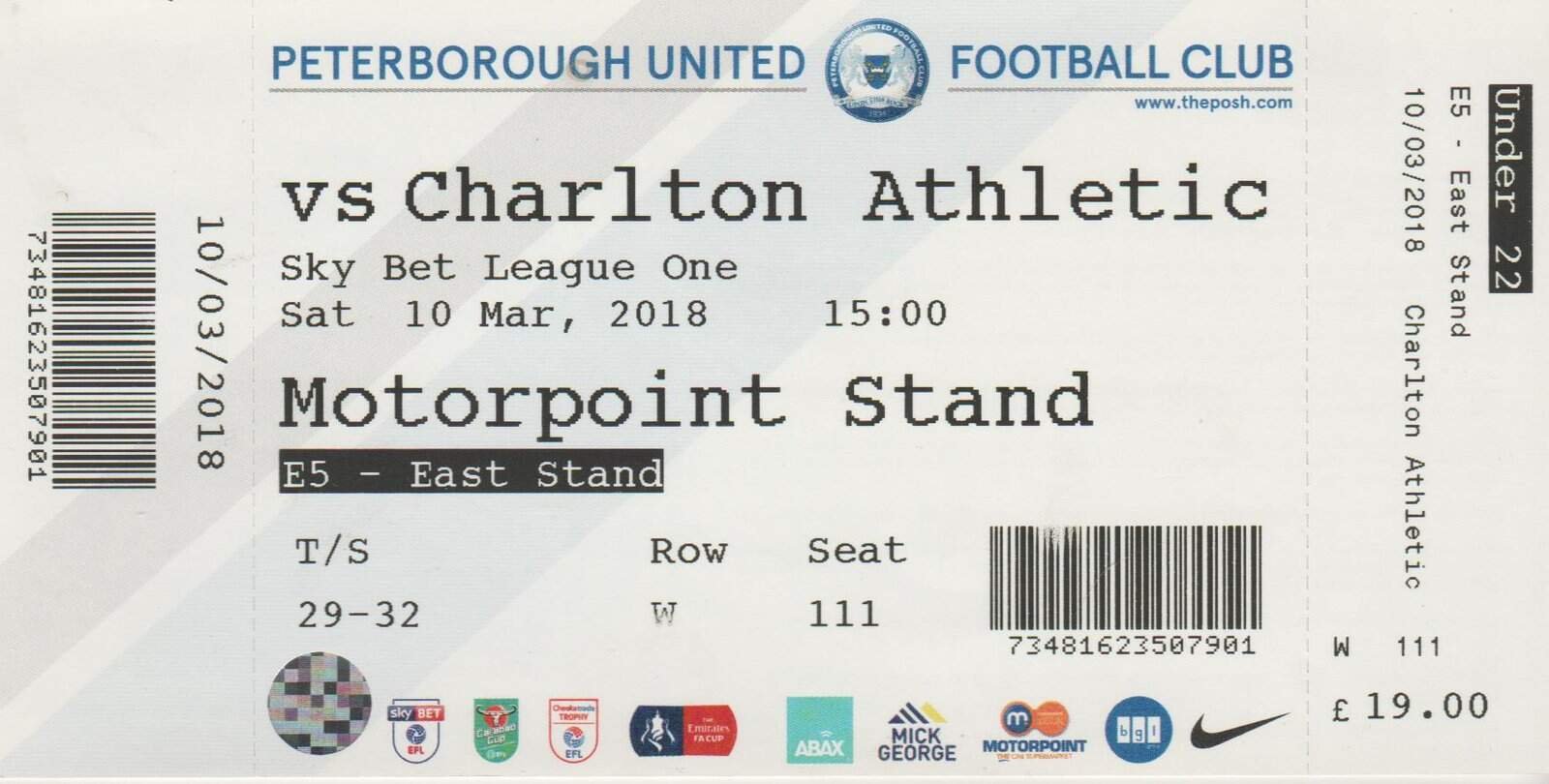 Match: Peterborough United v Charlton Athletic Competition: League 1 Date: 10-Mar-2018 Comments: Rating: 4 Condition: Very good Weight in grams: 20