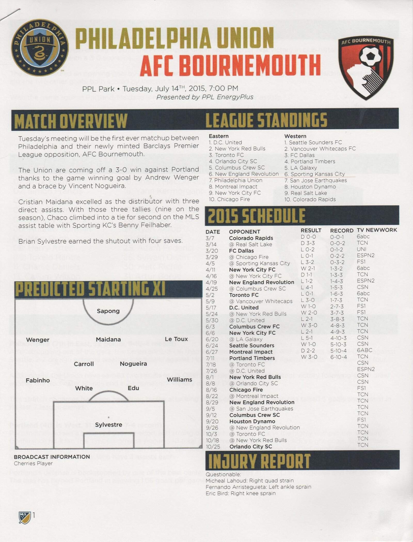 Match: Philadelphia Union v AFC Bournemouth Competition: Friendly Date: 14-Jul-2015 Comments: 4 Single sheets stapled together Rating: 4 Condition: Very good Weight in grams: 40