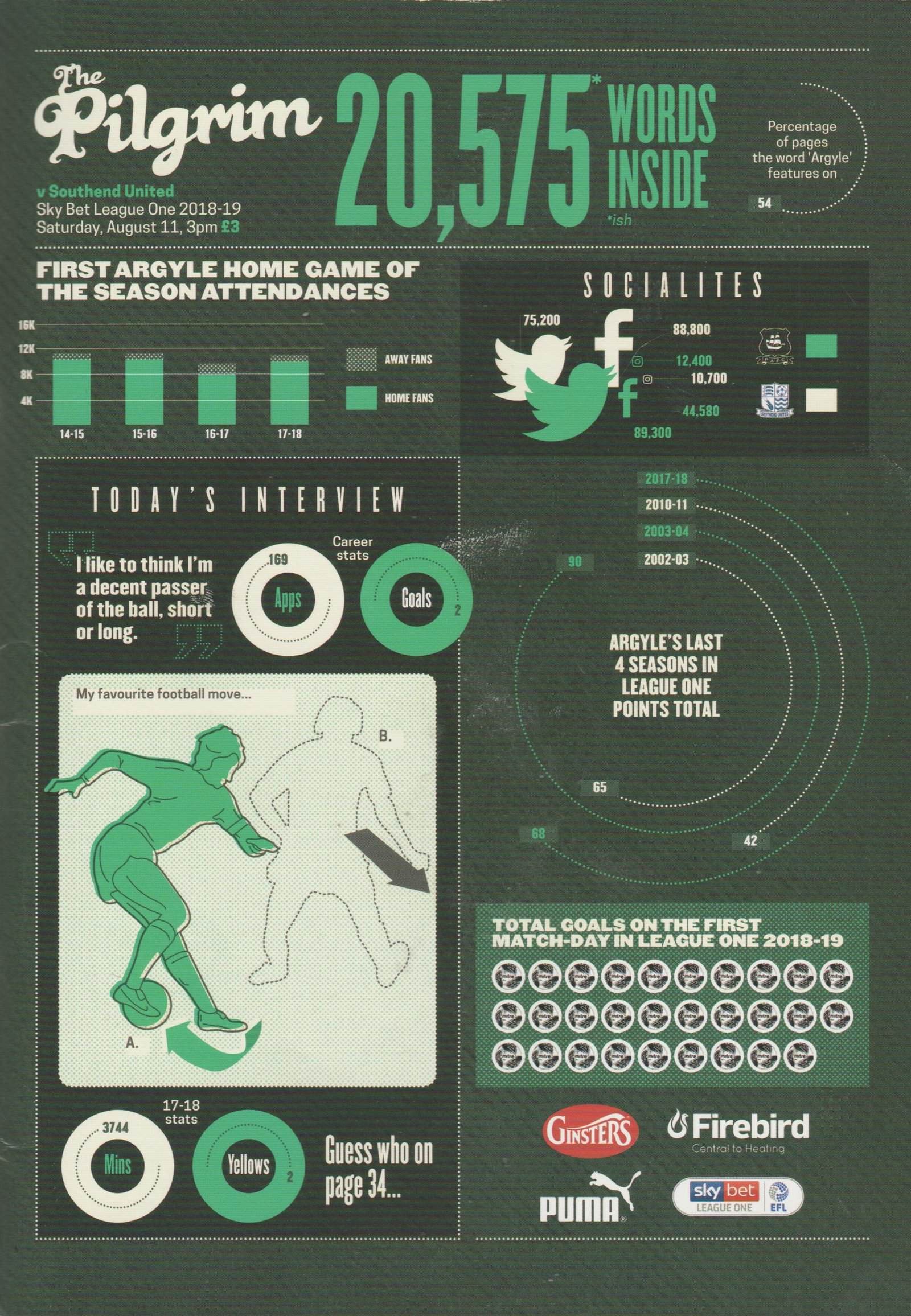 Match: Plymouth Argyle v Southend United Competition: League 1 Date: 11-Aug-2018 Comments: Rating: 4 Condition: Very good Weight in grams: 200