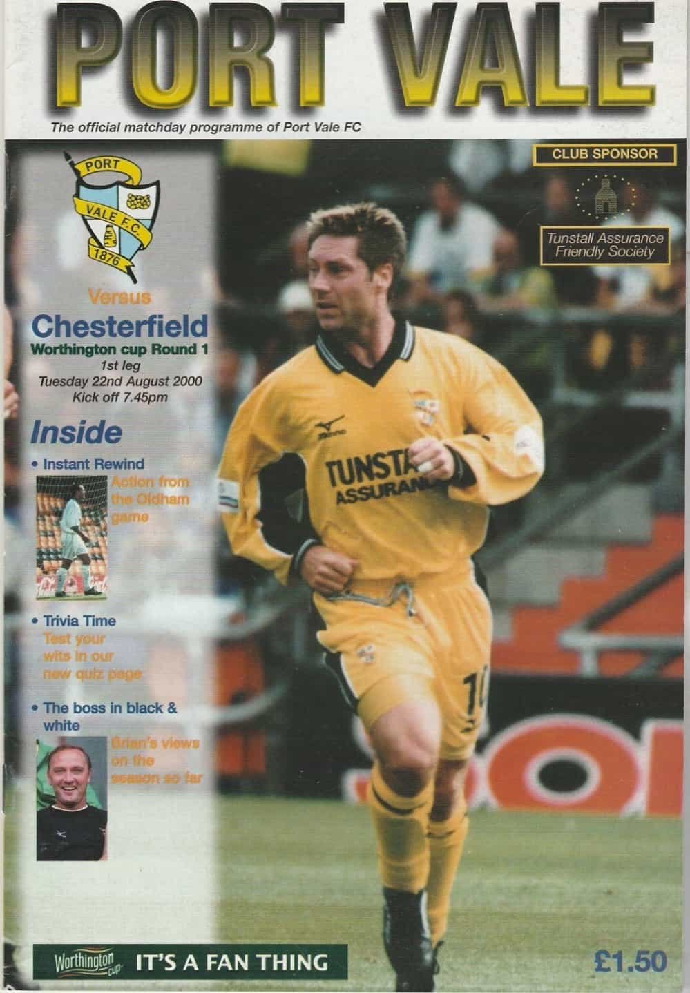 Match: Port Vale v Chesterfield Competition: League Cup 1st Round 1st leg Date: 22-Aug-2000 Comments: Rating: 4 Condition: Very good Weight in grams: 160
