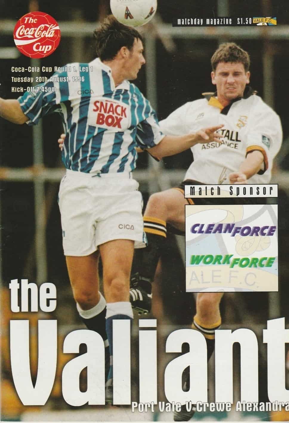 Match: Port Vale v Crewe Alexandra Competition: League Cup1st Round 1st leg Date: 20-Aug-1996 Comments: Rating: 3 Condition: Slight corner fold on back page Weight in grams: 140