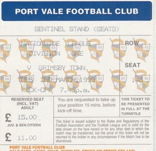 Match: Port Vale v Grimsby Town Competition: Nationwide League Division 1 Date: 02-03-1999` Comments: Rating: 4 Condition: Very good Weight in grams: 10
