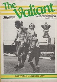 Match: Port Vale v Lincoln City Competition: FA Cup 1st Round Replay Date: 30-11-1981 Comments: Rating: 3 Condition: Slight mark on bottom of cover Weight in grams: 60