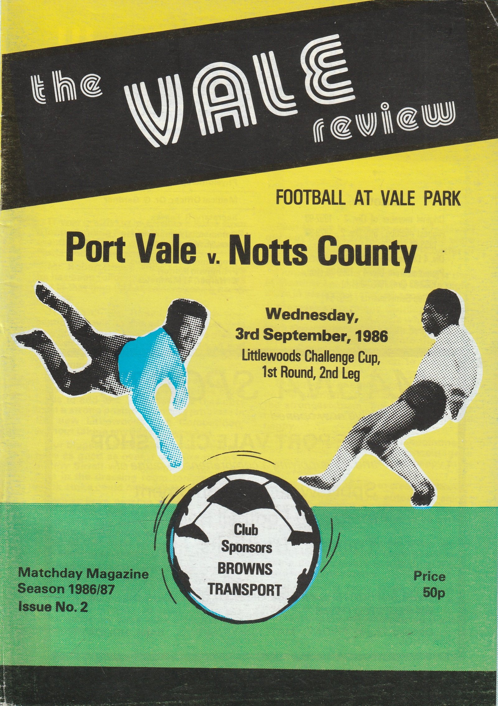 Match: Port Vale v Notts County Competition: Littlewoods Cup 1st Round 2nd leg Date: 03-Sep-1986 Comments: Rating: 4 Condition: Very good Weight in grams: 120