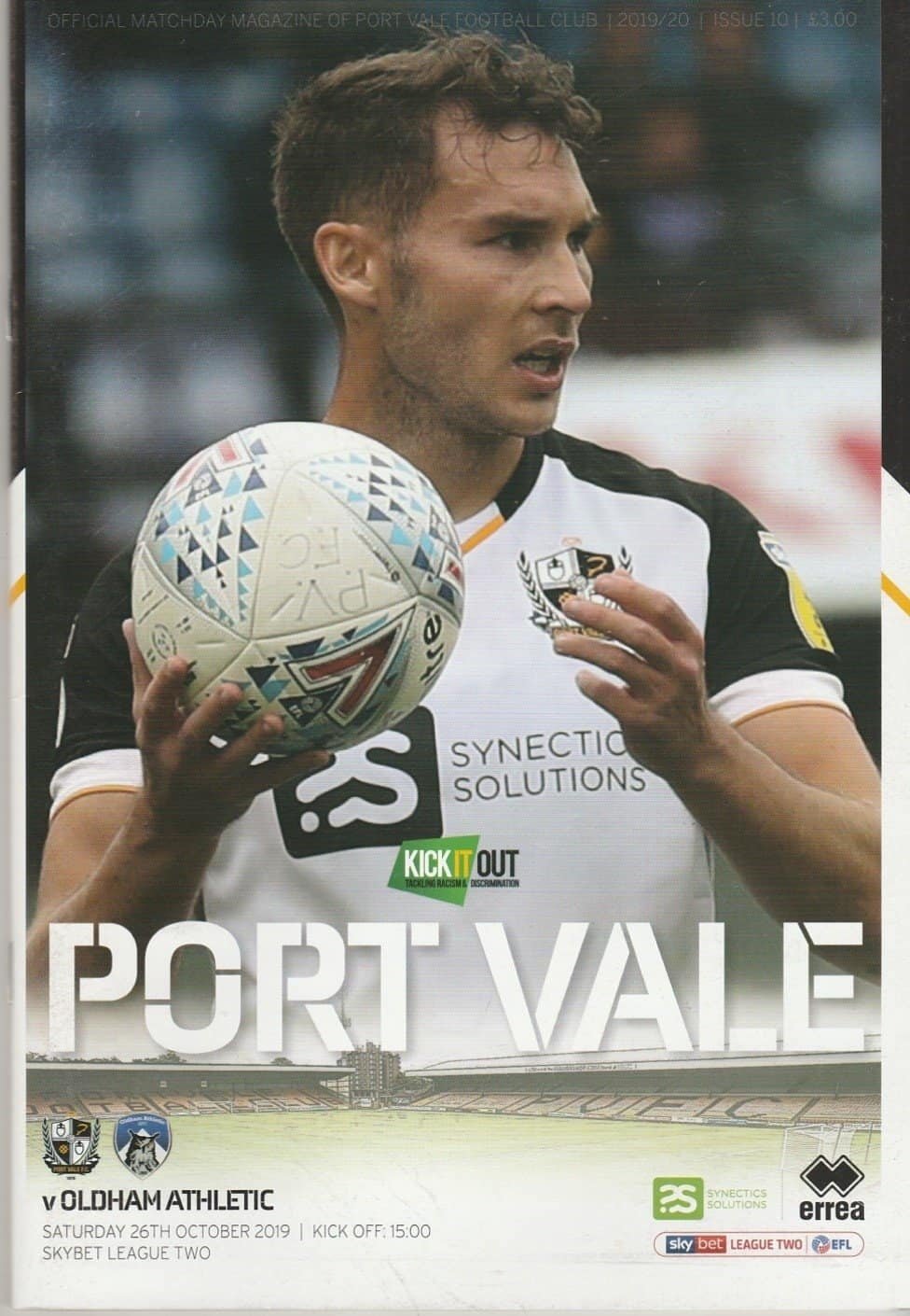 Match: Port Vale v Oldham Athletic Competition: League 2 Date: 26-Oct-2019 Comments: Rating: 3 Condition: Print imperfection on back page Weight in grams: 240