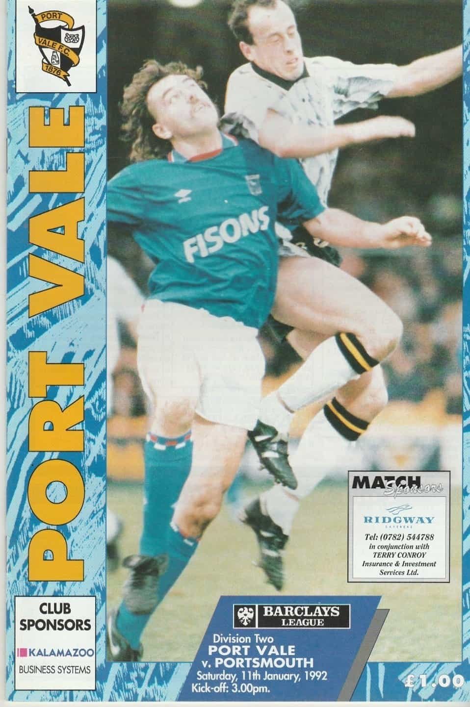 Match: Port Vale v Portsmouth Competition: League Division 2 Date: 11-Jan-1992 Comments: Rating: 4 Condition: Very good Weight in grams: 100