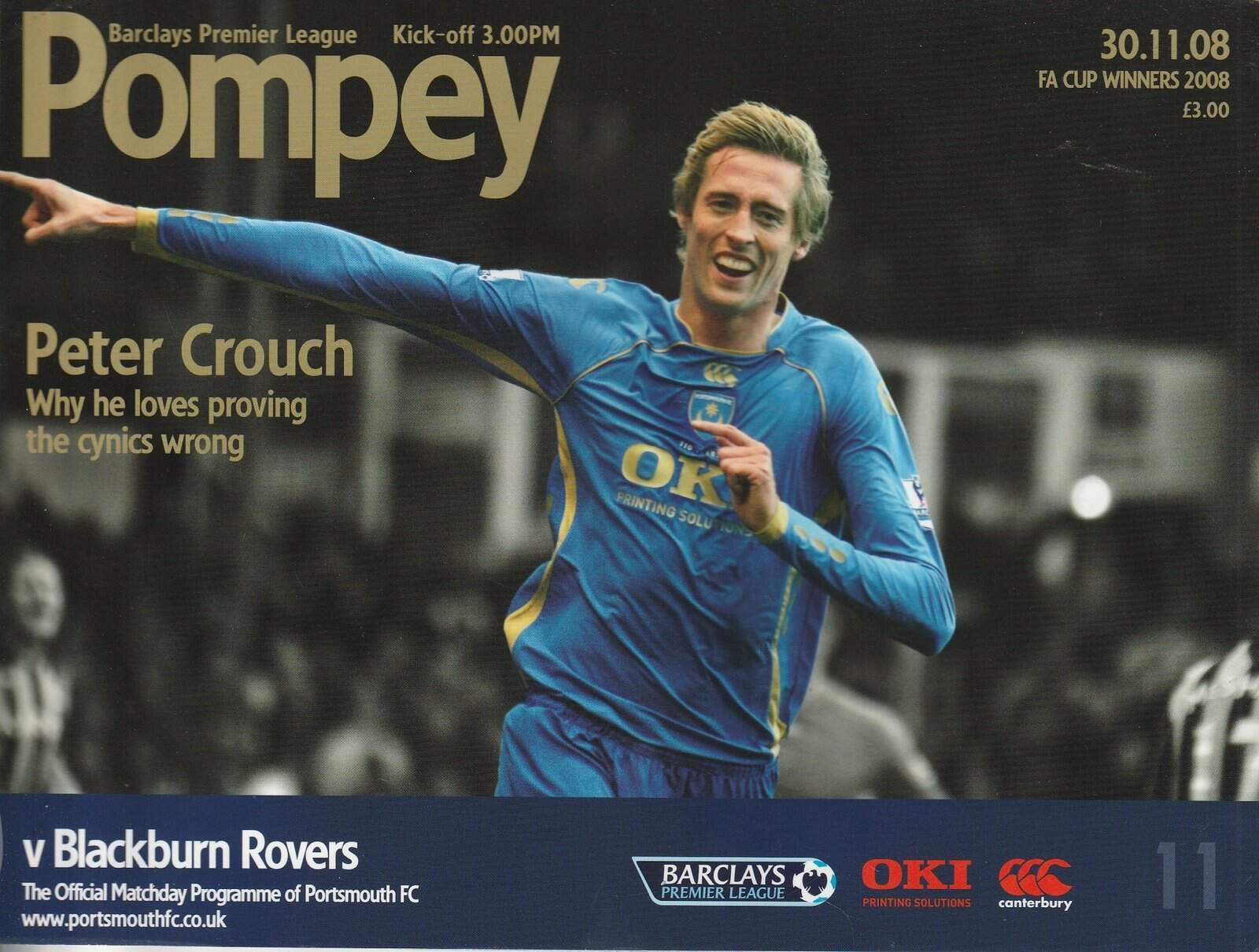 Match: Portsmouth v Blackburn Rovers Competition: Premier League Date: 30-Nov-2008 Comments: Rating: 4 Condition: Very good Weight in grams: 260
