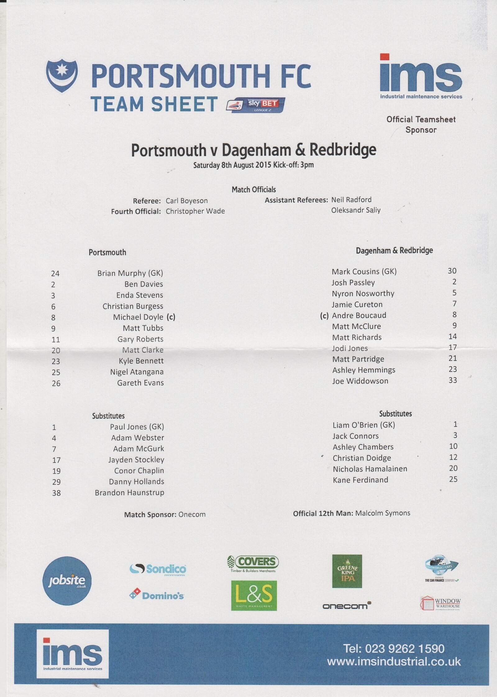 Match: Portsmouth v Dagenham& Redbridge Competition: League 2 Date: 08-Aug-2015 Comments: Rating: 4 Condition: Fold Weight in grams: 20
