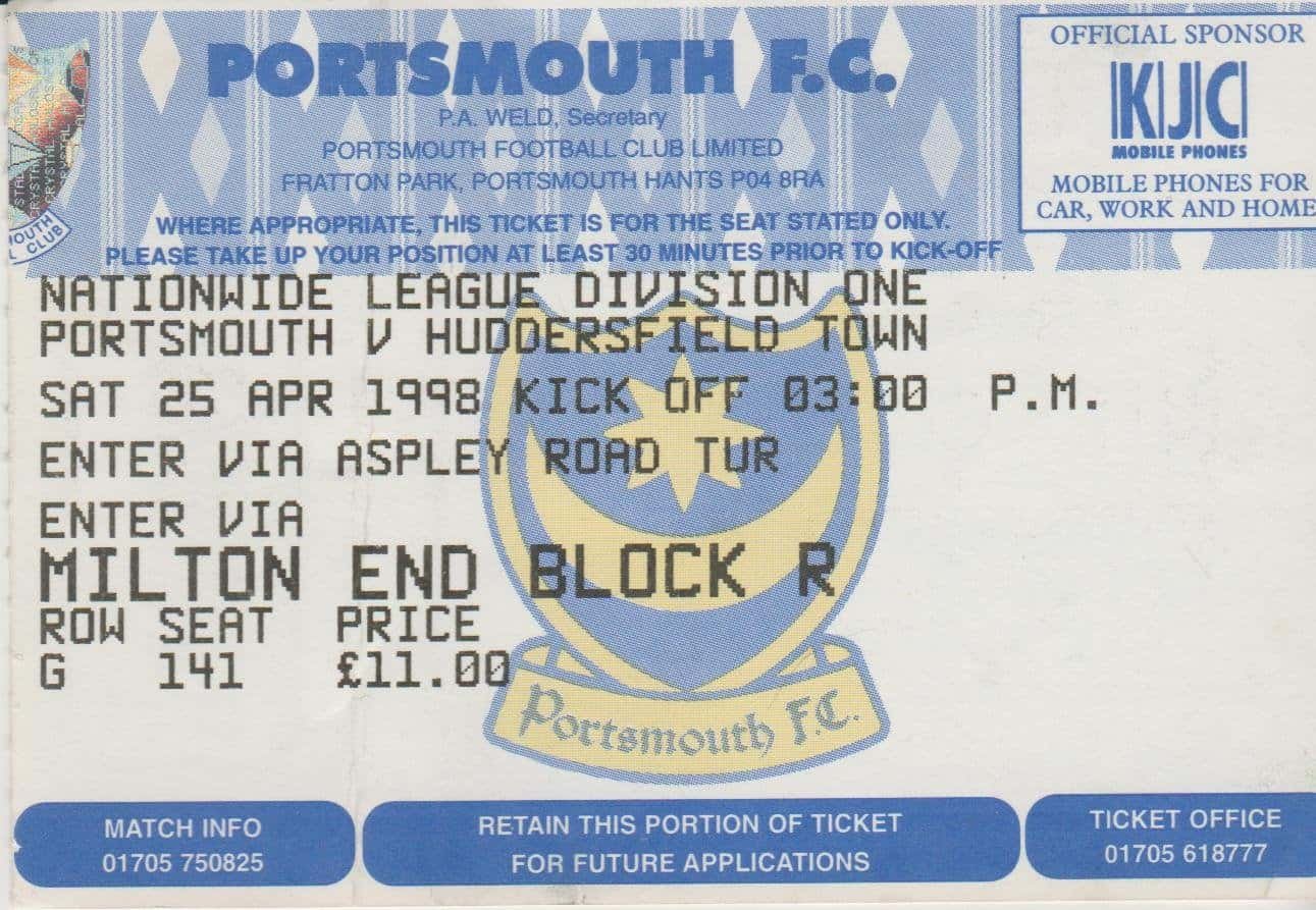 Match: Portsmouth v Huddersfield Town Competition: Nationwide League Division 1 Date: 25-04-1998 Comments: Rating: 4 Condition: Very good Weight in grams: 10