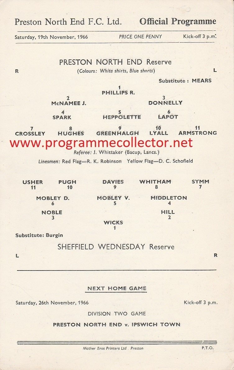 Match: Preston North End Reserves v Sheffield Wednesday Reserves Competition: Central League Date: 19-Nov-1966 Comments: Single sheet card Rating: 4 Condition: Very good Weight in grams: 20