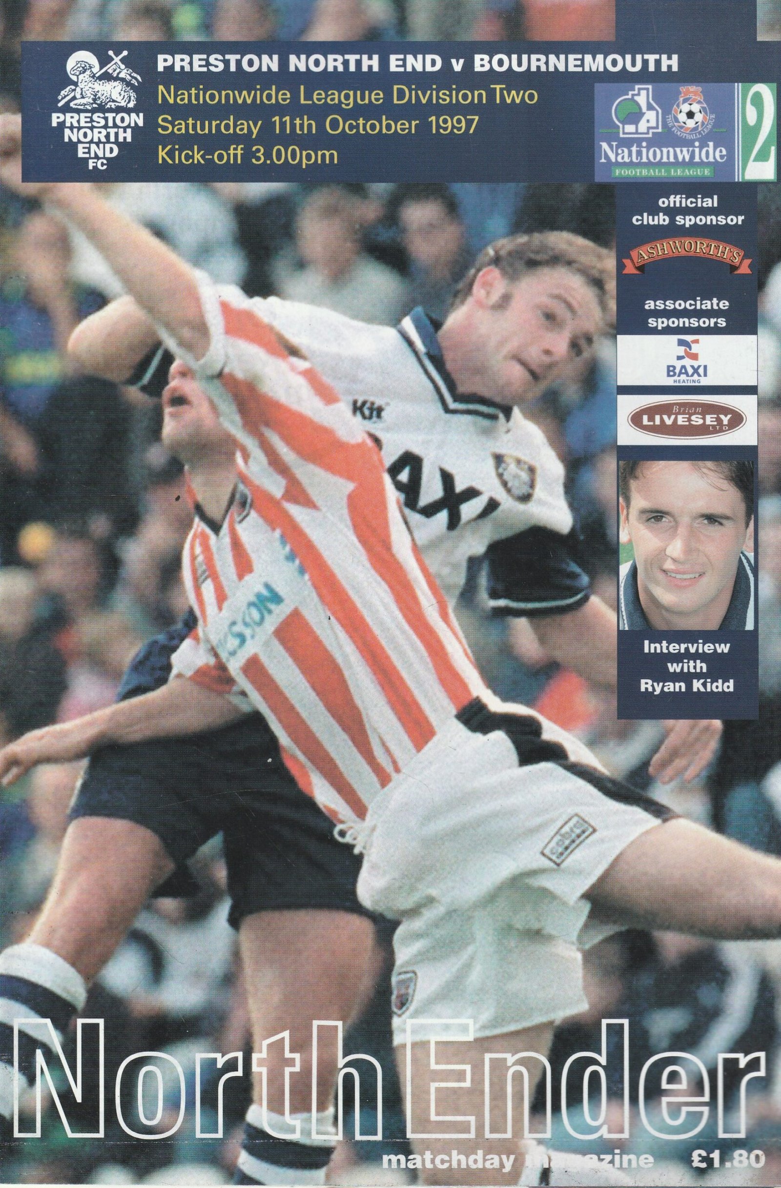 Match: Preston North End v AFC Bournemouth Competition: League Division 2 Date: 11-Oct-1997 Comments: Rating: 3 Condition: Marks and soiling on back page Weight in grams: 160