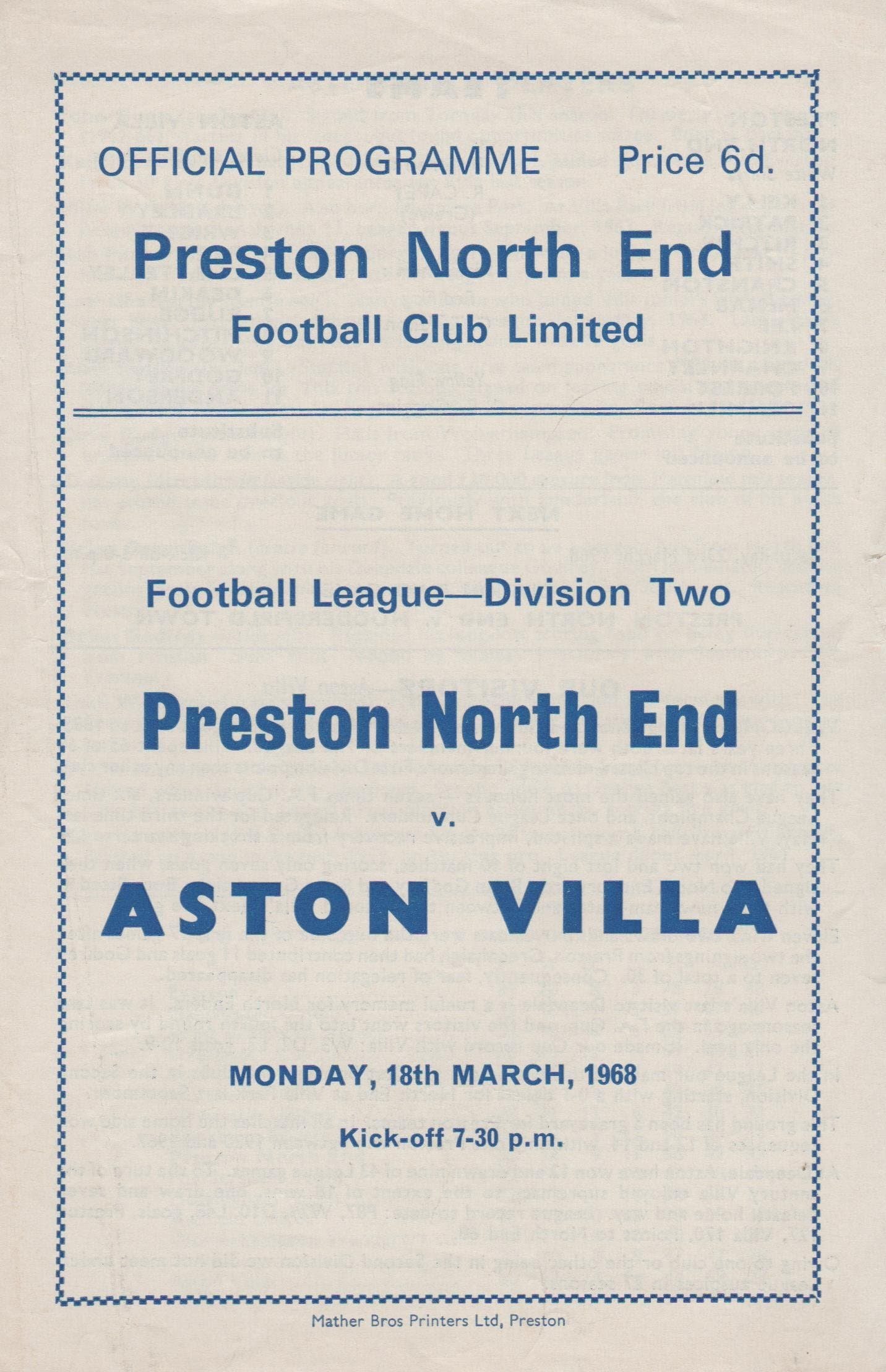 Match: Preston North End v Aston Villa Competition: League Division 2 Date: 18-Mar-1968 Comments: 4 page issue Rating: 3 Condition: Light crease and nick to edge of cover Weight in grams: 20