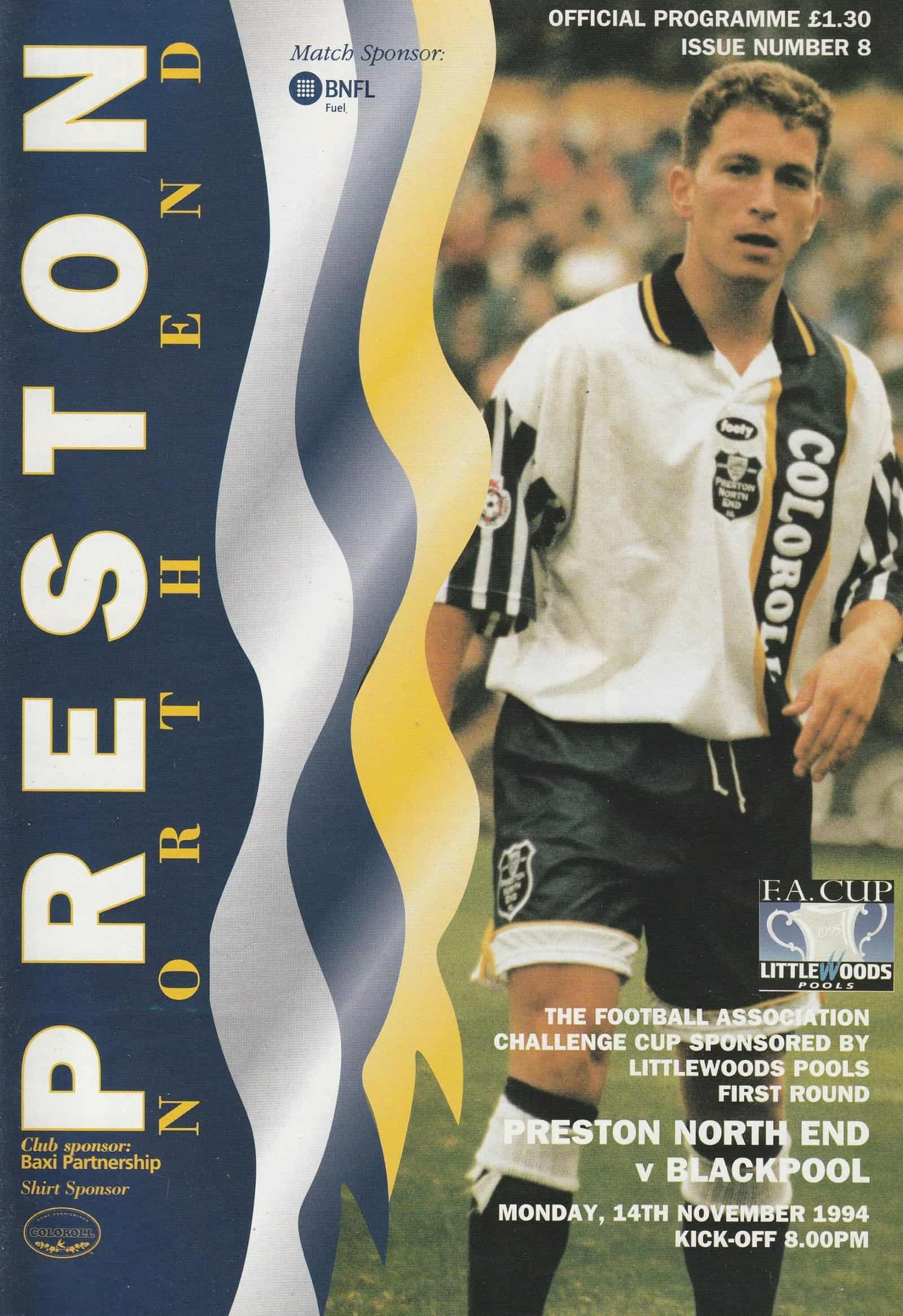 Match: Preston North End v Blackpool Competition: FA Cup 1st Round Date: 14-Nov-1994 Comments: Rating: 4 Condition: Very good Weight in grams: 160
