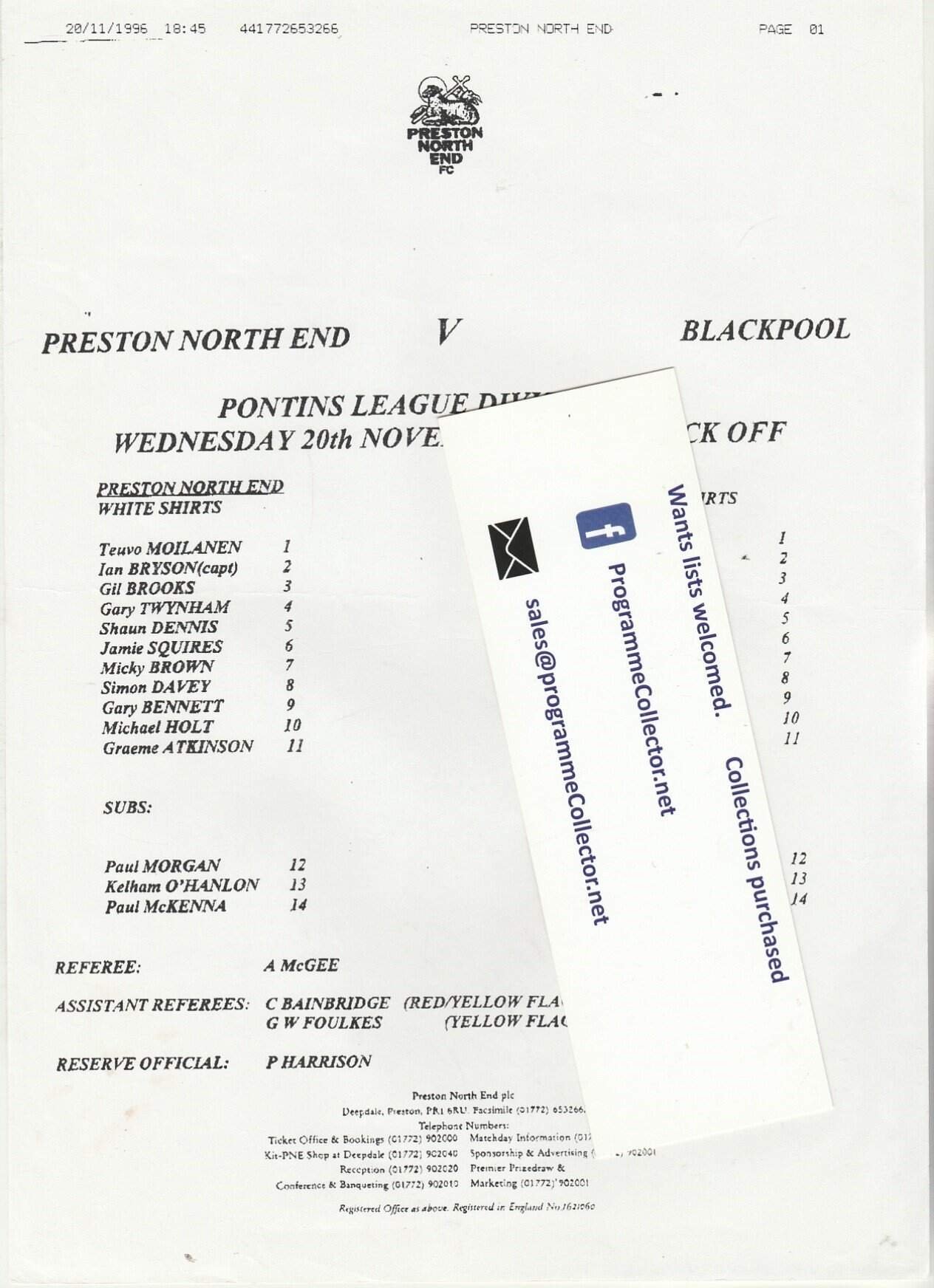 Match: Preston North End Reserves v Blackpool Reserves Competition: Pontins League Division 1 Date: 20-Nov-1996 Comments: Single sheet – Facsimile copy? Rating: 4 Condition: Very good Weight in grams: 20