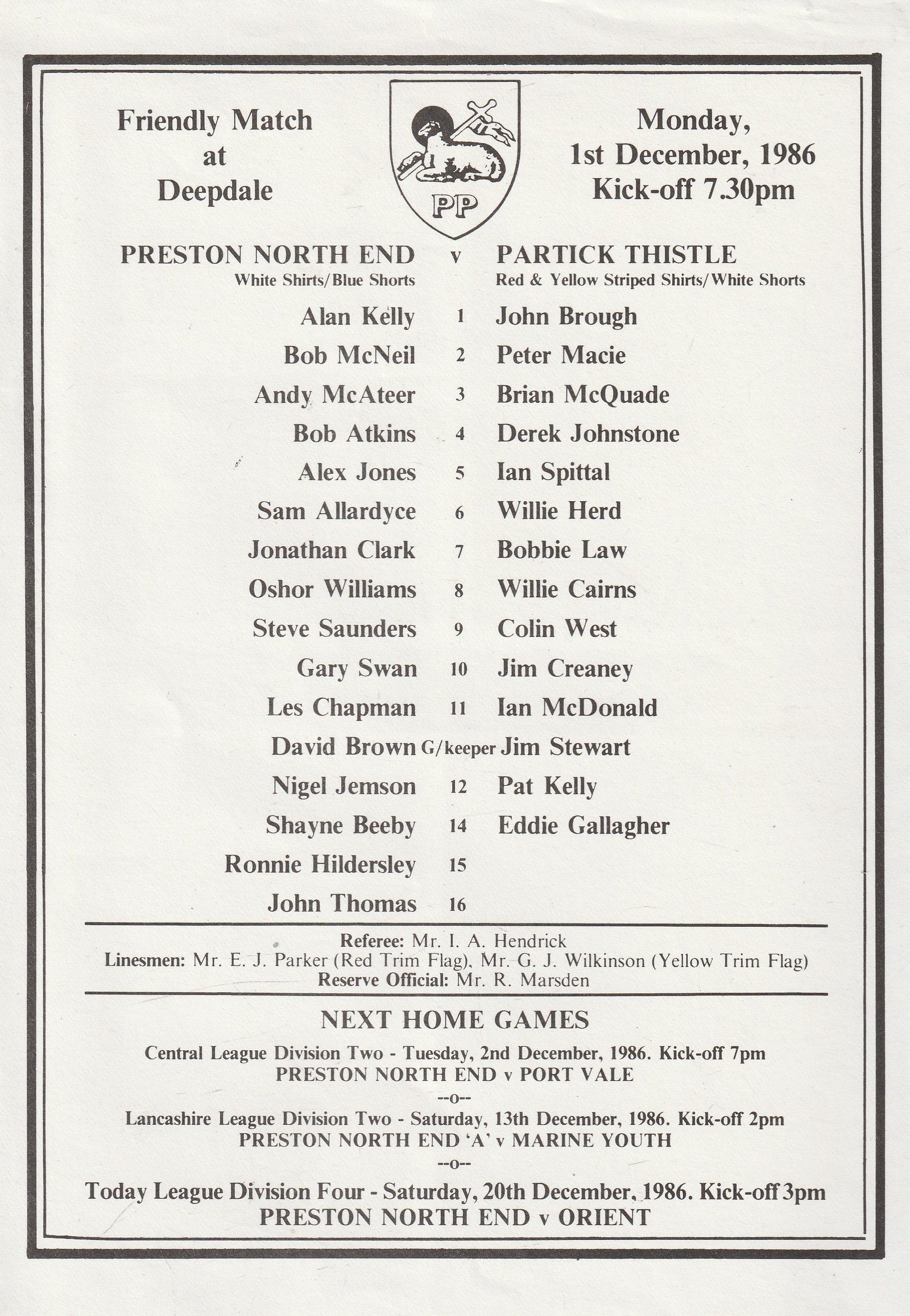 Match: Preston North End v Partick Thistle Competition: Friendly Date: 01-Dec-1986 Comments: Single sheet Rating: 4 Condition: Very good Weight in grams: 40